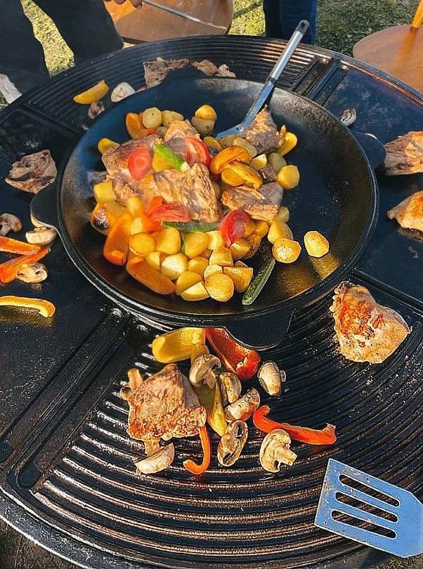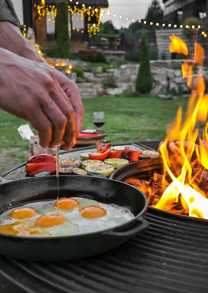 - гриль-зона и все необходимое к ней: мангал, гриль-стол, дрова, розжиг, шампуры, решётка, посуда;