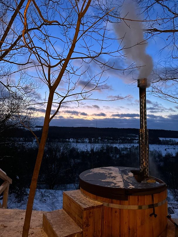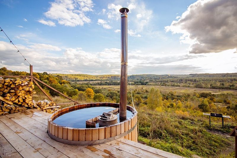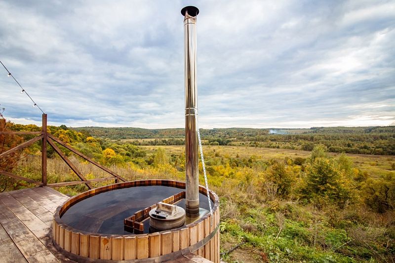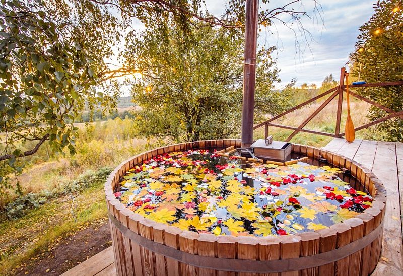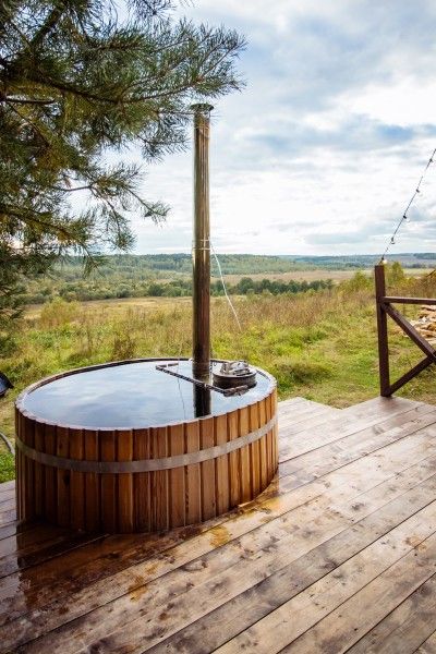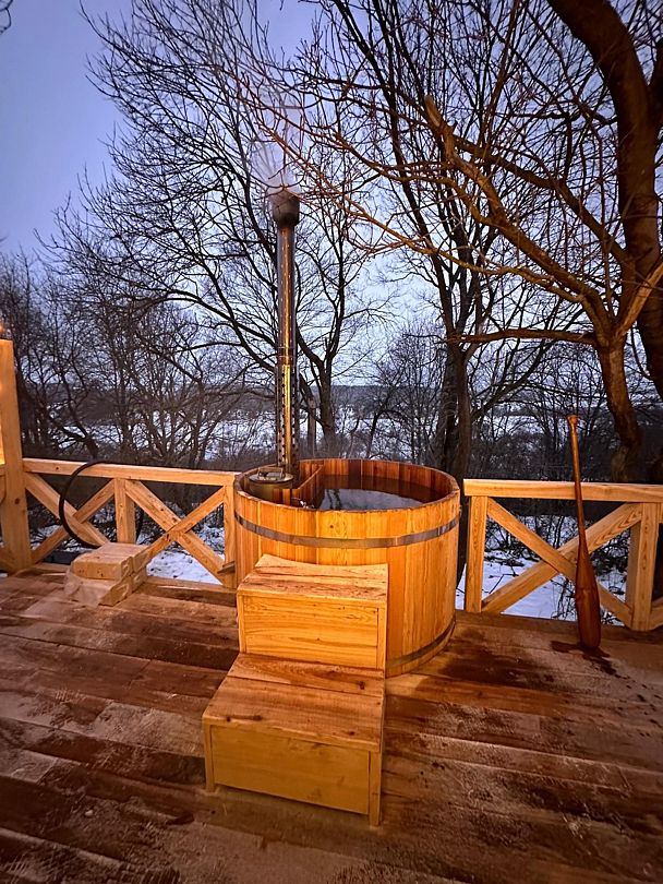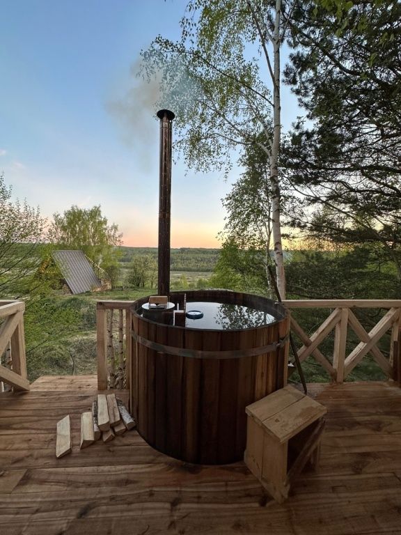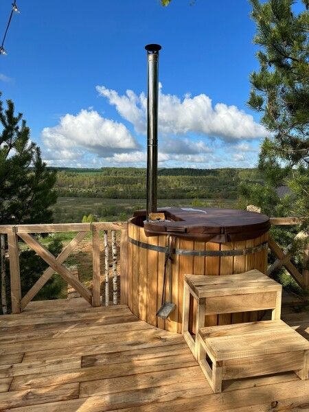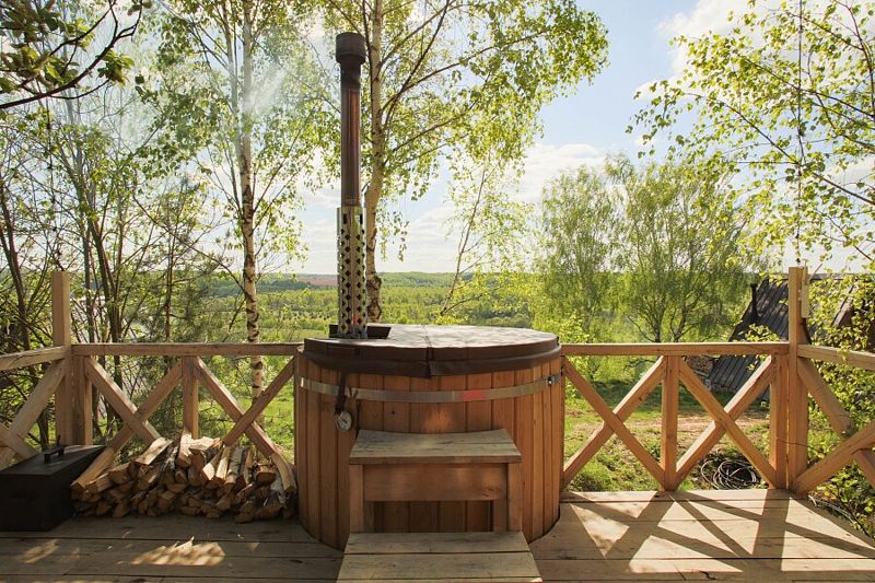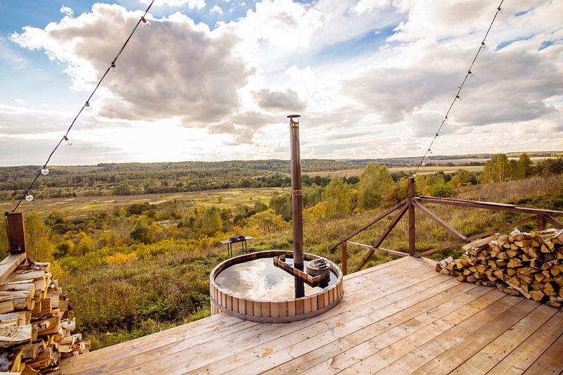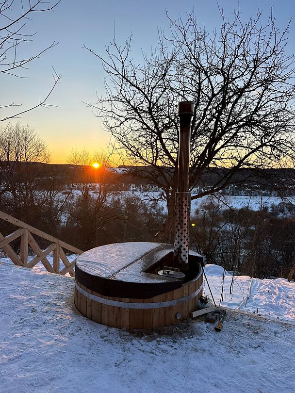 Расслабьтесь в горячей купели, вдыхая свежий вечерний воздух и любуясь ярким закатом. Стоимость аренды и растопки купели — 5000 ₽ (без ограничений по времени). Возможно дополнительное оформление.