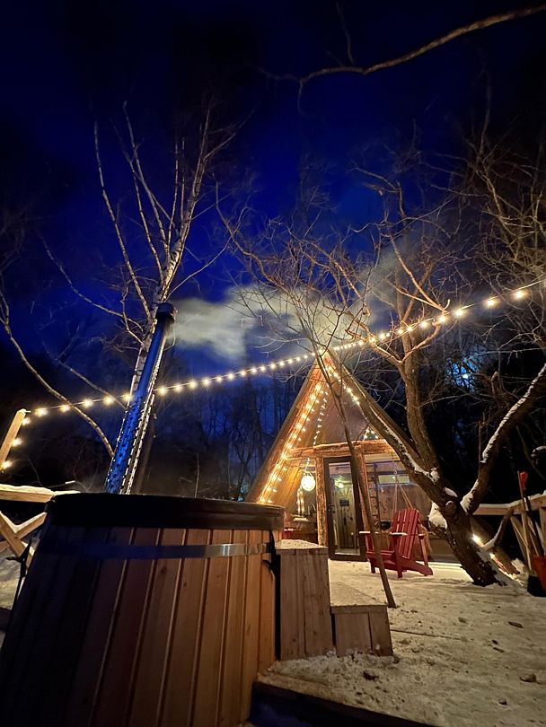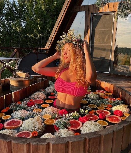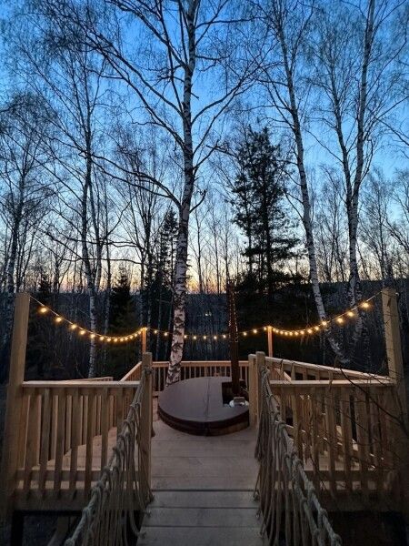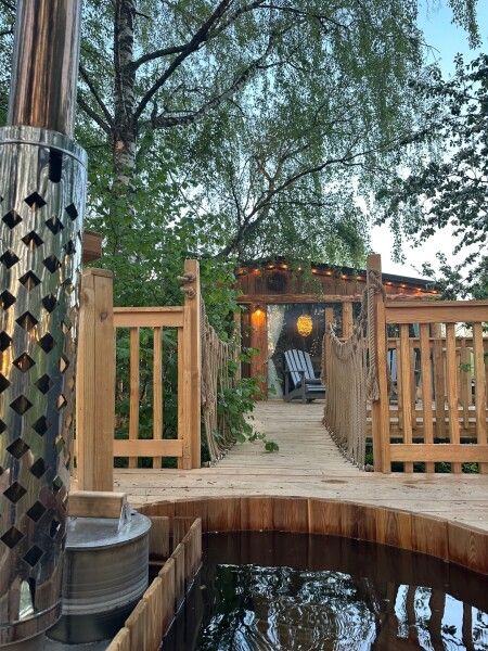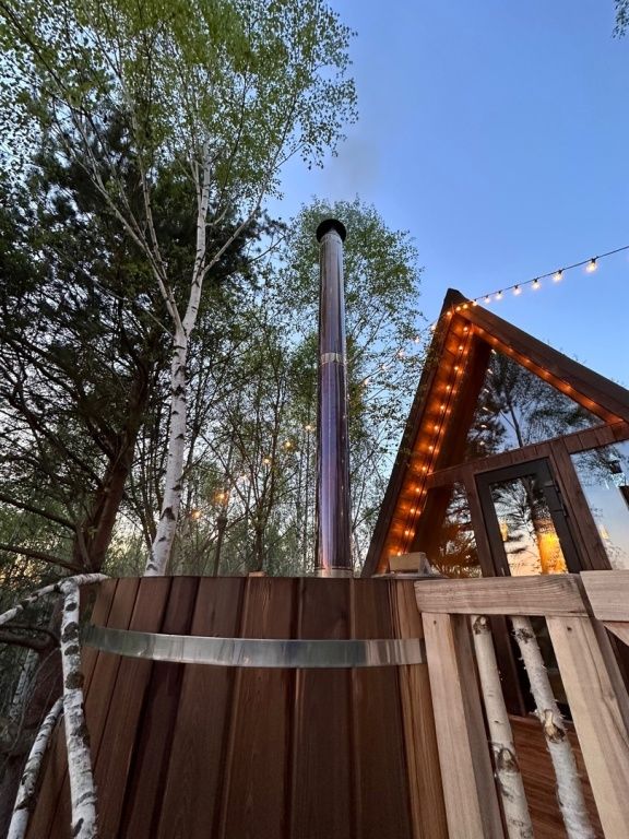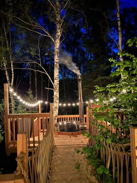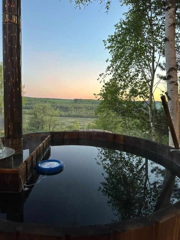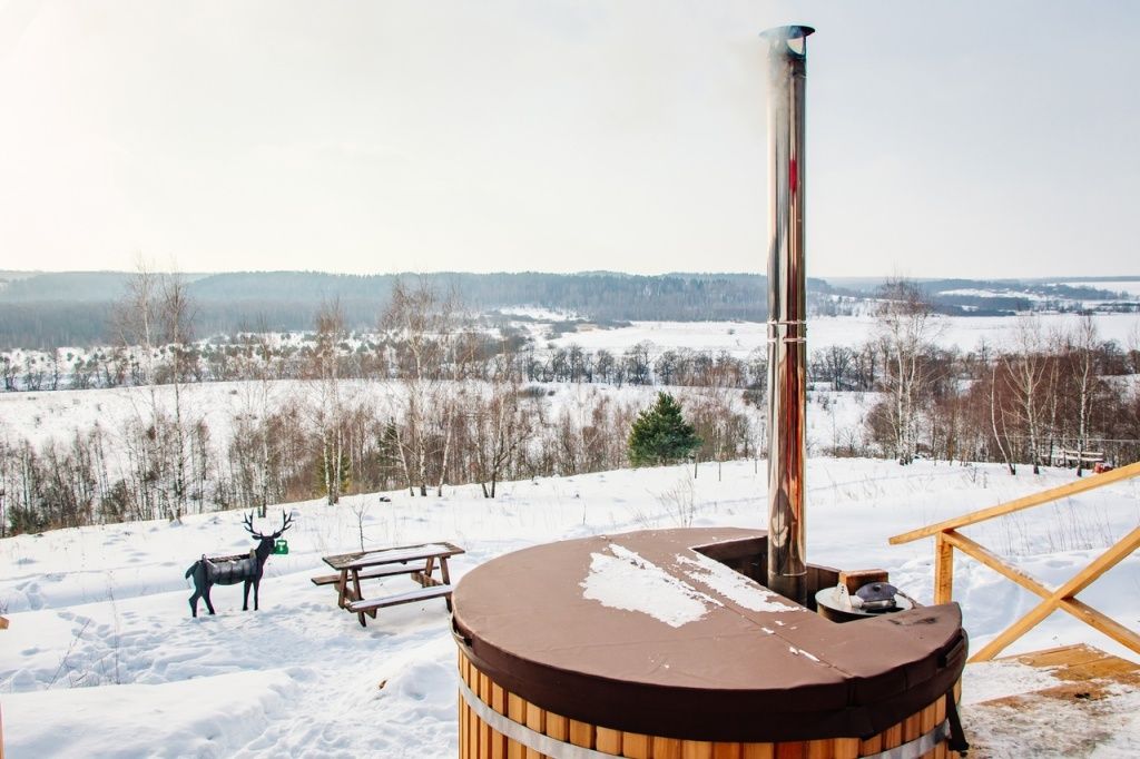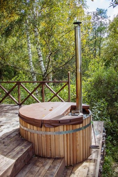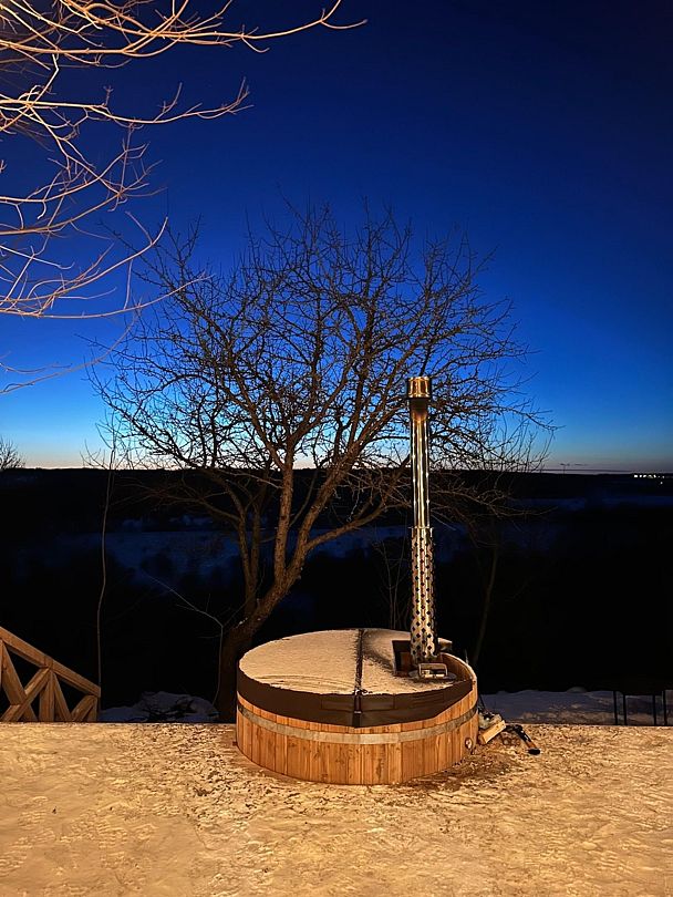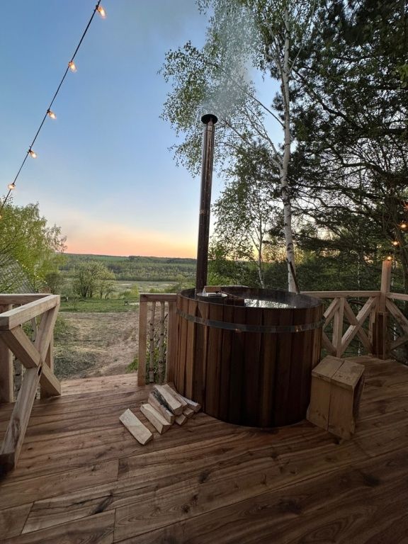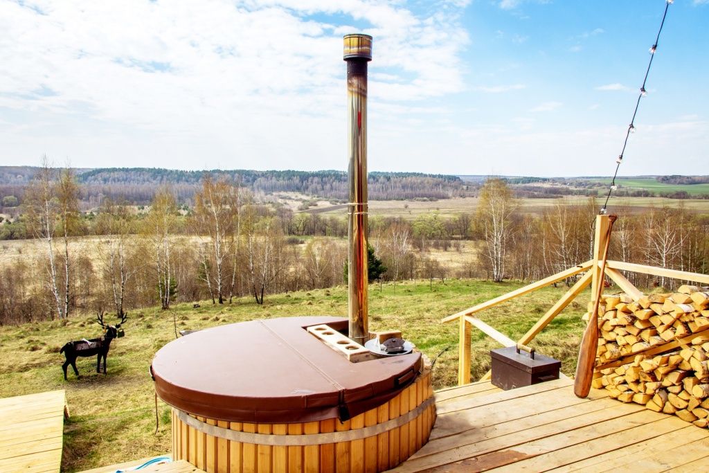 Расслабьтесь в горячей купели, вдыхая свежий вечерний воздух и любуясь ярким закатом. Стоимость аренды и растопки купели — 5000 ₽ (без ограничений по времени). Возможно дополнительное оформление.