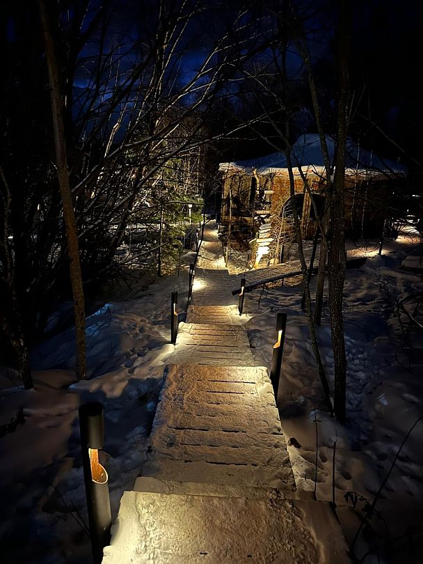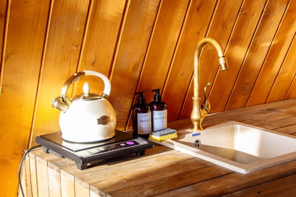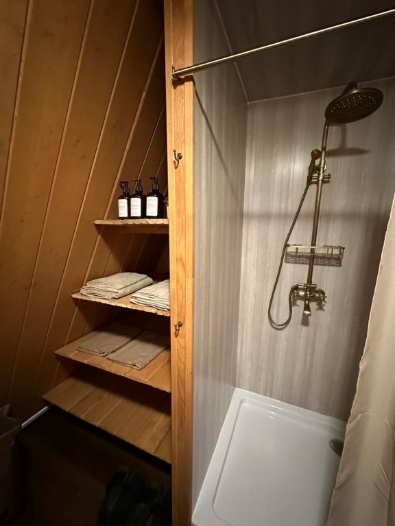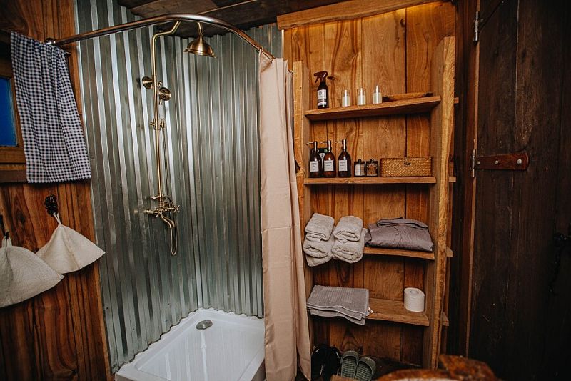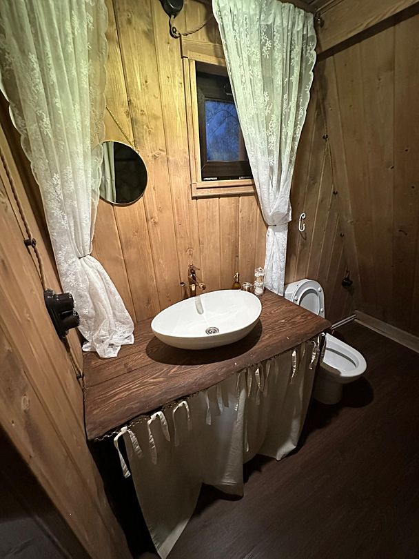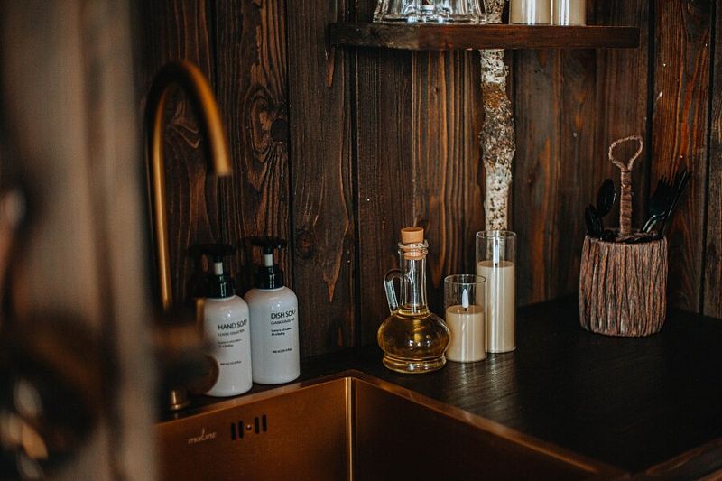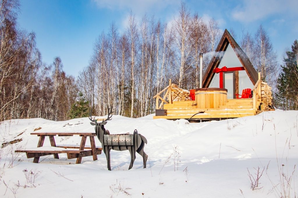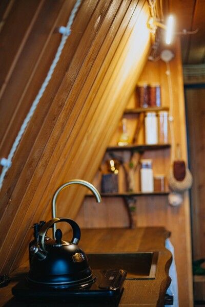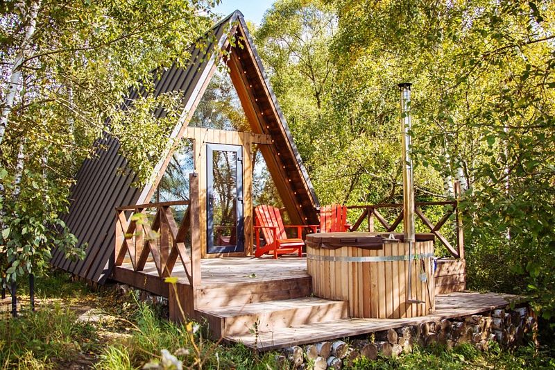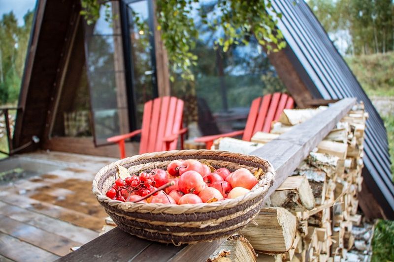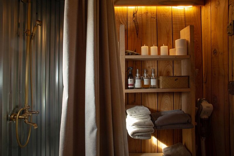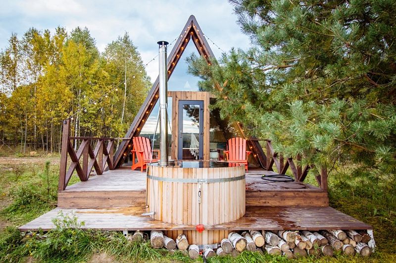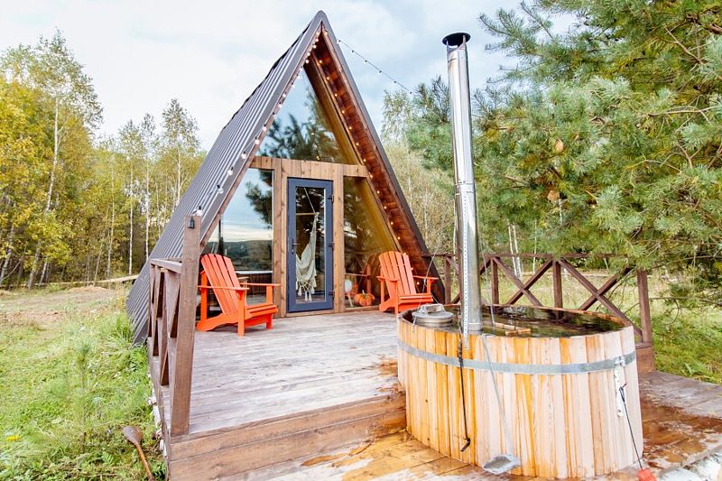Изюминка глэмпинга — видовые горячие купели «Фурако» из лиственницы, расположенные на террасе каждого шале. Купель растапливается к вашему приезду, время купания не ограничено — оставляются дополнительные дрова.