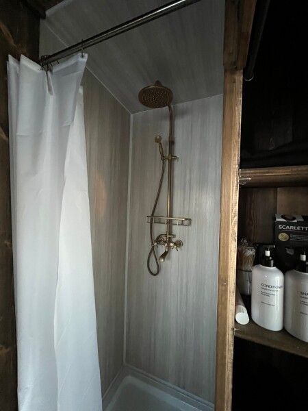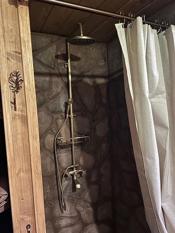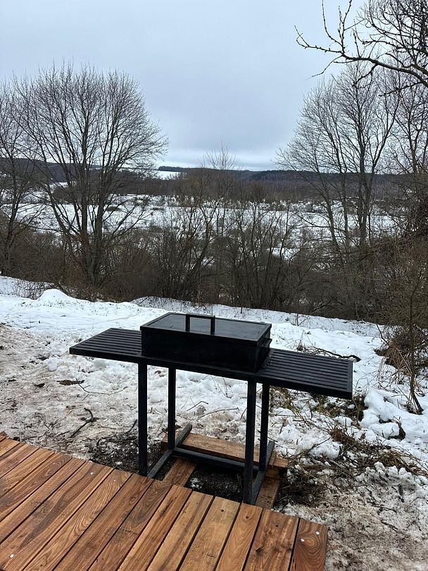 На террасе расположена горячая купель из лиственницы диаметром 1.6 метра, рассчитанная на 2-3 взрослых людей (растопка за доп. плату).
