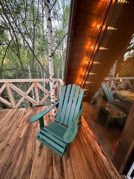 Шале 18 кв. м с большой террасой 22 кв. м. Рассчитано на 2 взрослых людей. Потрясающий вид на березовую рощу. На террасе расположена горячая купель из лиственницы диаметром 1.6 метра, рассчитанная на 2-3 взрослых людей.