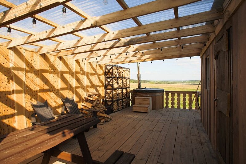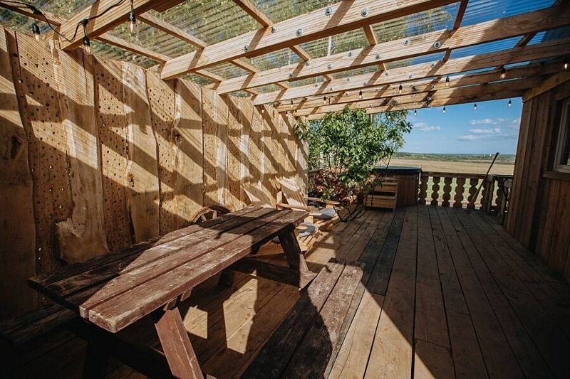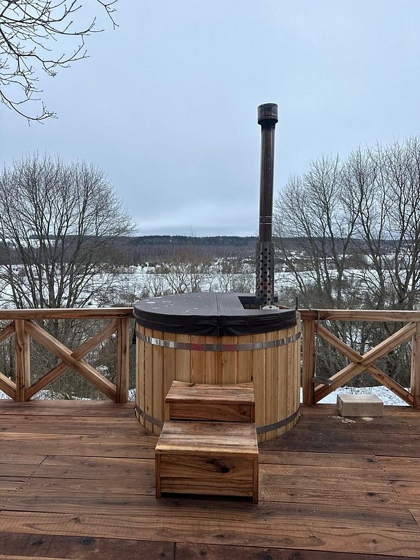 На террасе расположена горячая купель из лиственницы диаметром 1.6 метра, рассчитанная на 2-3 взрослых людей.