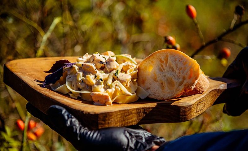 - настоящая полевая кухня на открытом огне (оборудованная полевая кухня, блюда ресторанного качества от шеф-повар; всё свежее — готовится к вашему приезду;