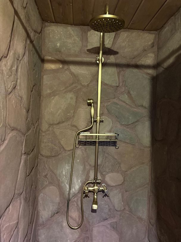На террасе расположена горячая купель из лиственницы диаметром 1.6 метра, рассчитанная на 2-4 взрослых людей.