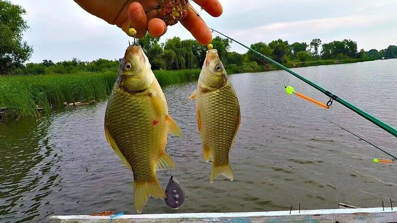 В пруду два вида рыбы — карась и карп среднего веса 700 гр. Ловим на поплавочную удочку по два 700 граммовых карпа на гостя.