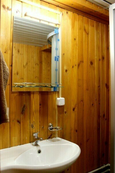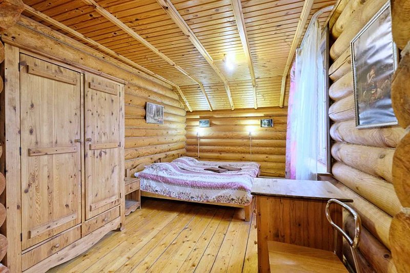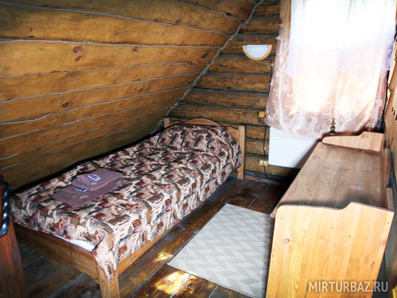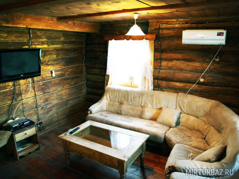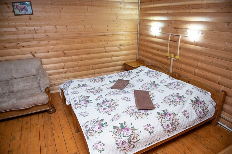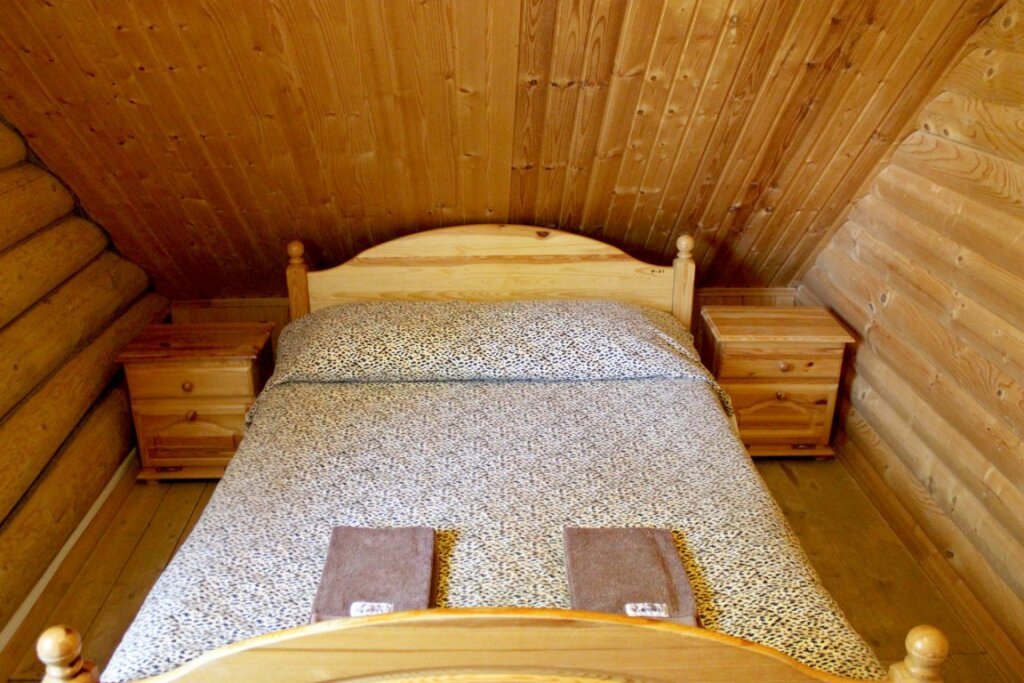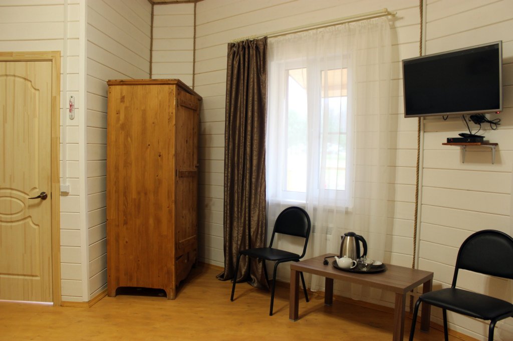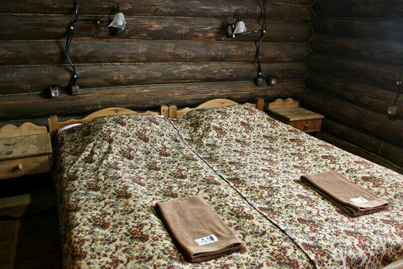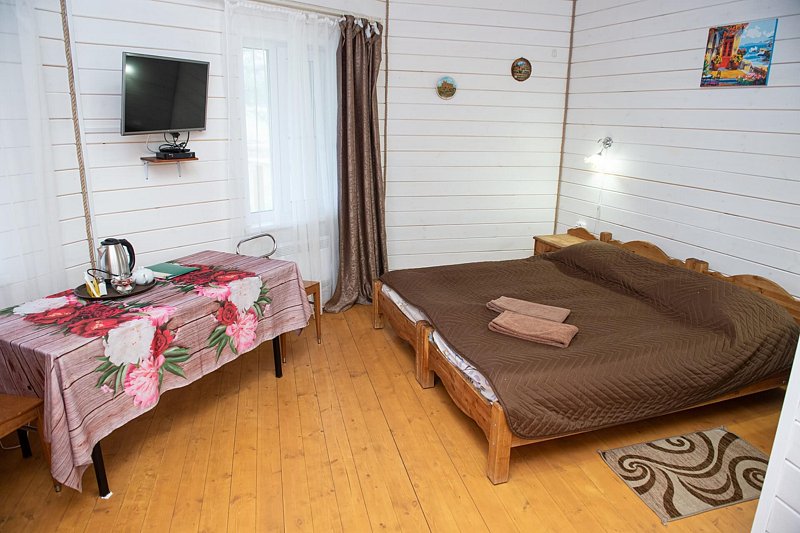 Для проживания предлагаются комфортабельные деревянные постройки с удобными спальными местами, телевизором и ванной комнатой.