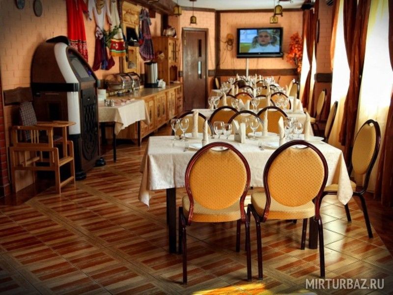 В некоторых коттеджах есть кухонный гарнитур для приготовления еды. Ресторан базы отдыха предлагает завтрак и обед в формате "шведский стол", а также блюда европейской и русской кухни по меню. В лобби-баре можно насладиться горячими напитками и алкогольными коктейлями. Ресторан создает непринужденную атмосферу с помощью оригинальных декоративных элементов.