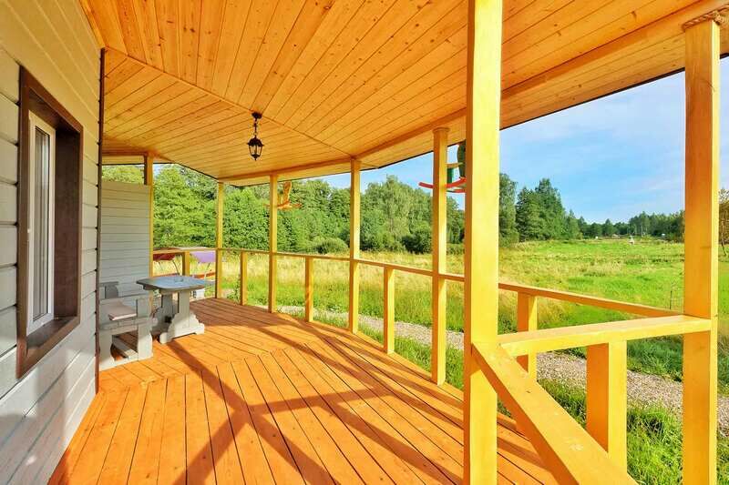 «Дом Карусель» — оригинальный одноэтажный деревянный дом. Дом разделен на 4 части, абсолютно независимые друг от друга. У каждой части своя терраса, мангал и беседка для барбекю.