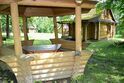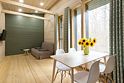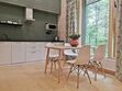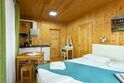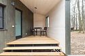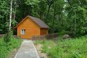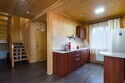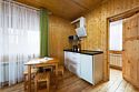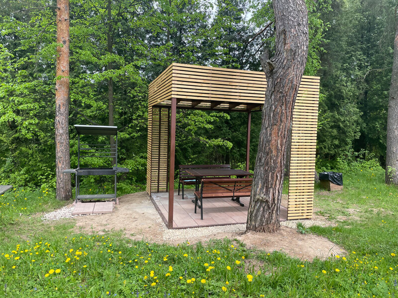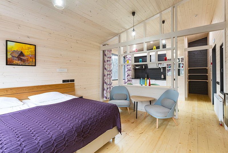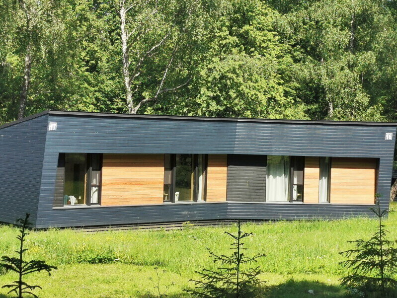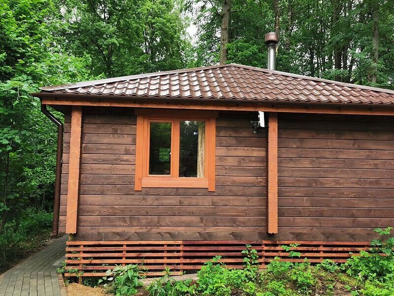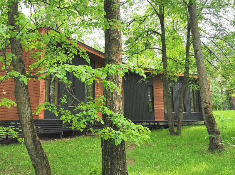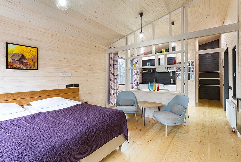 Односпальный коттедж в скандинавском стиле, с кухней и гостиной, сдвоенный и состоит из двух половинок, разделенных между собой техническим помещением. Около коттеджа площадка для барбекю, столом и лавочками, мангал.