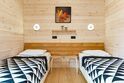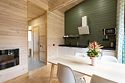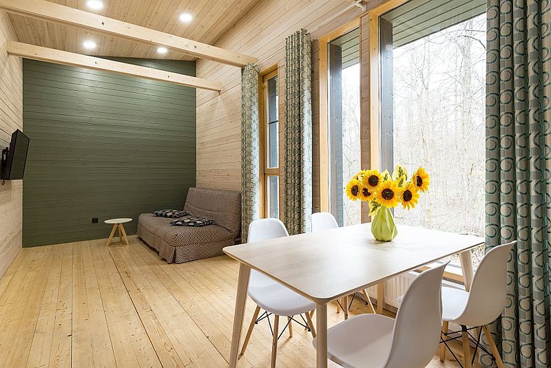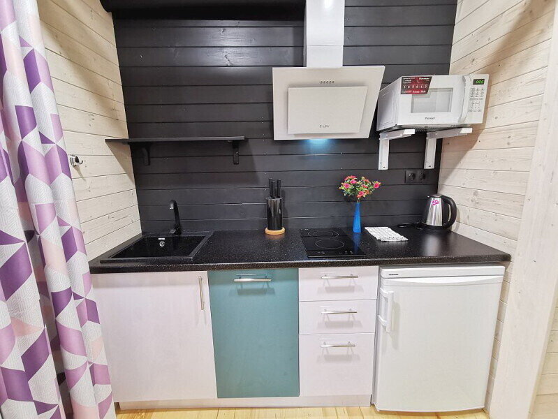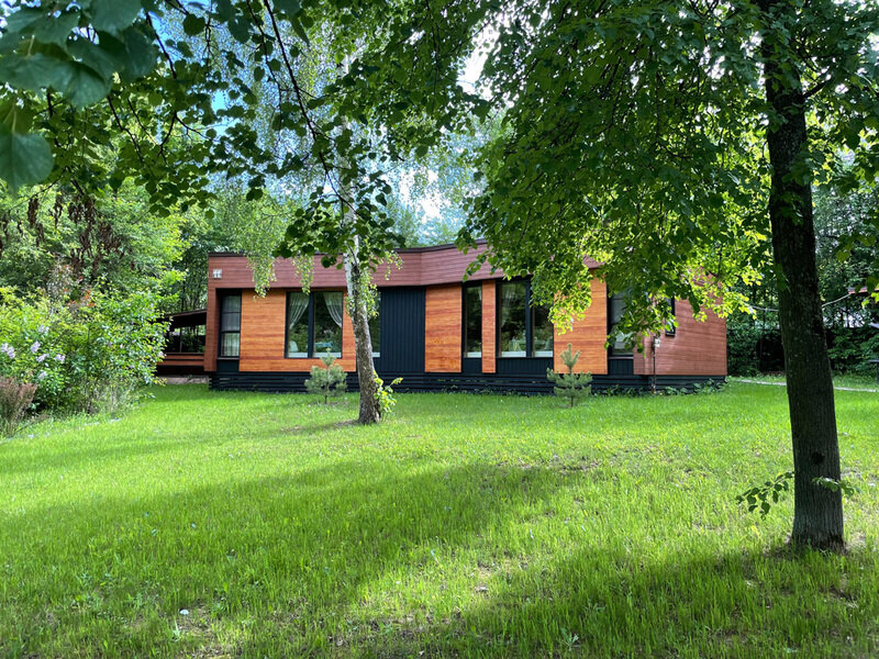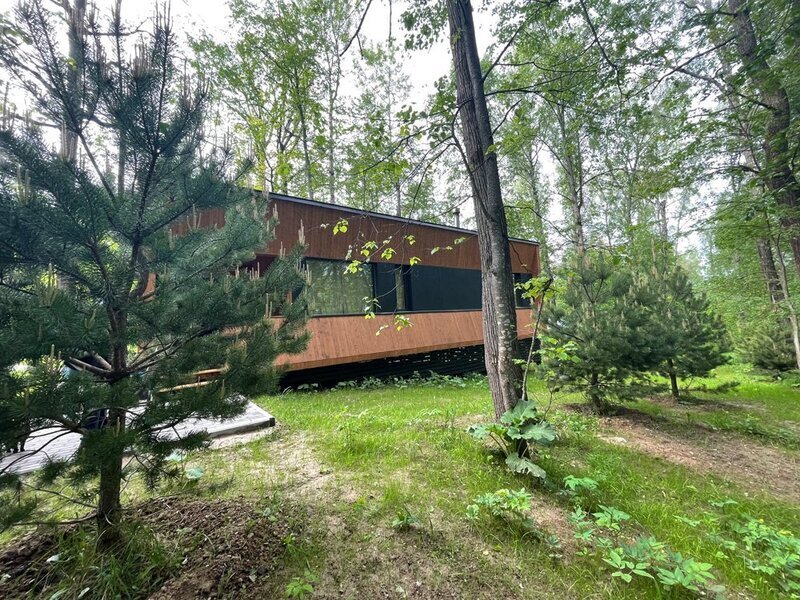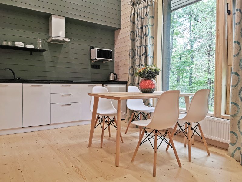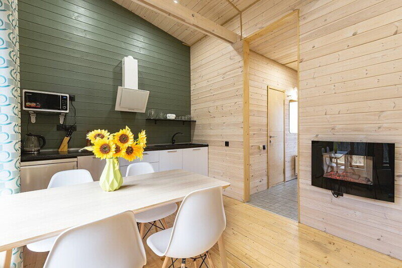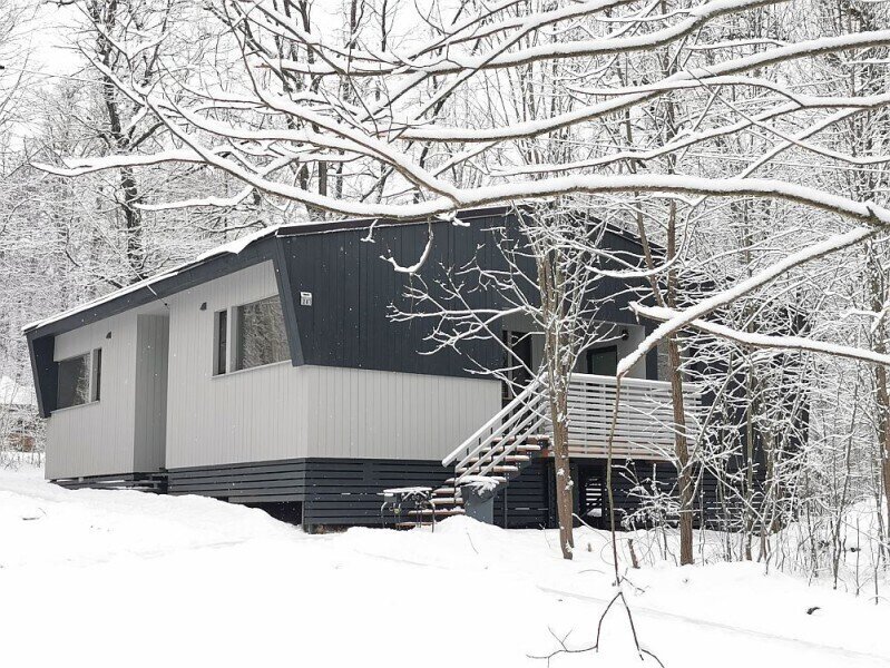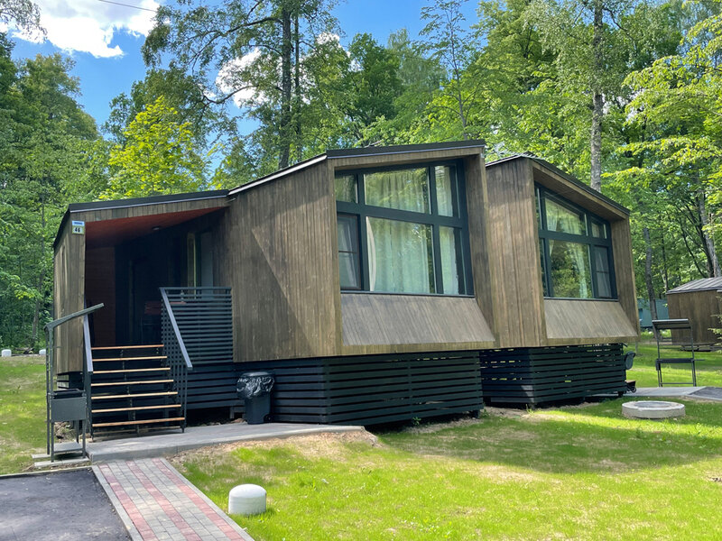 Коттедж в скандинавском стиле, имеет одну спальню и гостиную, кухню и террасу, рядом на открытой площадке мангал. Коттедж сдвоенный и состоит из двух половинок, разделенных между собой техническим помещением. Доступна услуга хранения багажа.