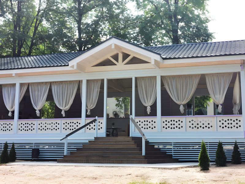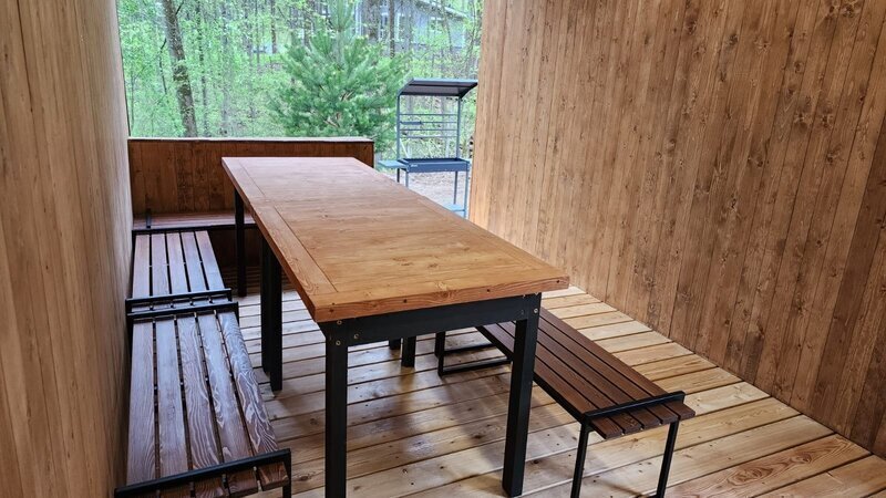 Коттедж в скандинавском стиле, имеет спальню с лаундж зоной, кухню, санузел, веранду и террасу со столом и лавочками. Рядом с коттеджем расположен мангал.