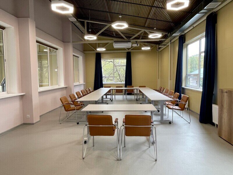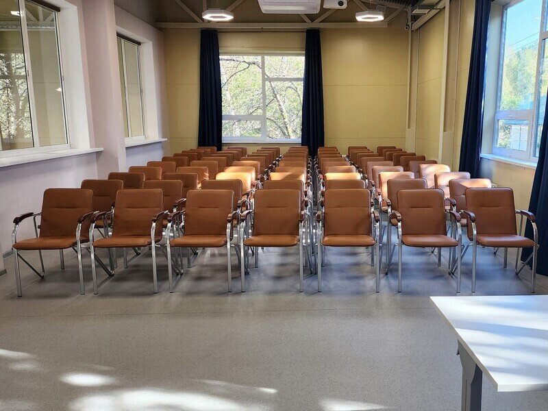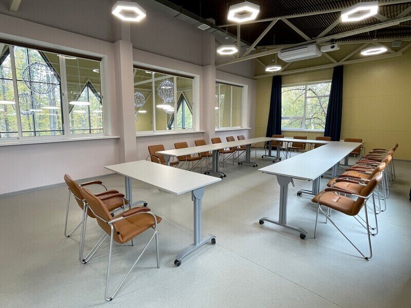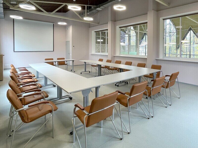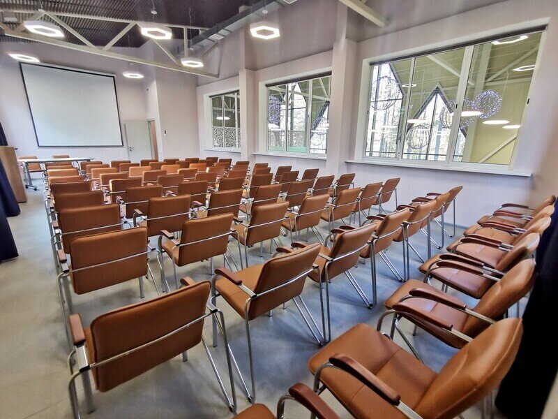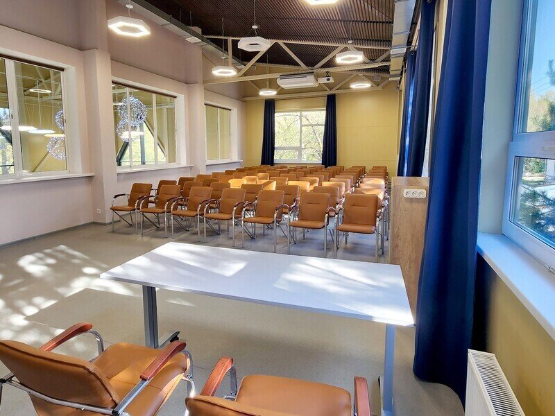 На втором этаже досугового центра располагается конференц-зал площадью 70 м2 с панорамным остеклением. Вместимость зала 20-80 человек. Он подходит для проведения различных мероприятий, таких как конференции, семинары, переговоры, групповые занятия йогой и кинопоказы. В здании имеется гардероб, санузлы и бар. Также возможна организация кофе-брейков и фуршетов для гостей. В зале есть техническое оборудование: проектор с экраном, музыкальная аппаратура, микрофон и флипчарт со сменными листами.