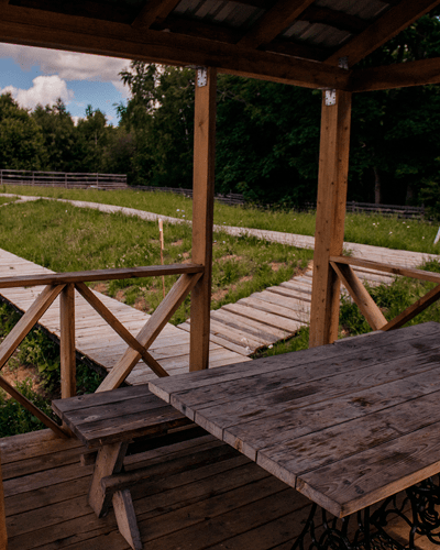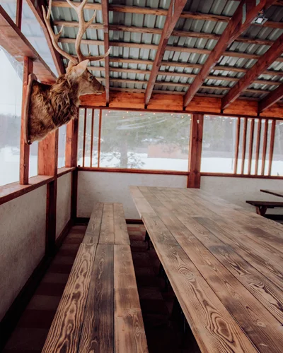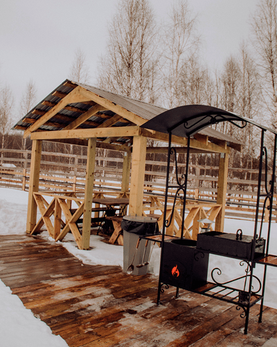 Просторная и комфортабельная беседка с окнами вмещает до 25-30 гостей и идеально подходит для крупных мероприятий и праздников. В ней есть розетки, и ее можно арендовать даже без проживания на территории отдыха. В аренду беседки не включена аренда самовара.