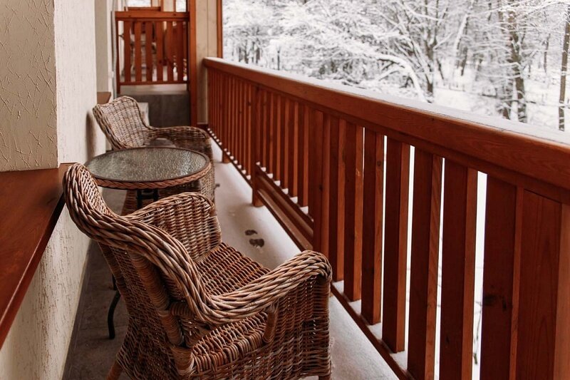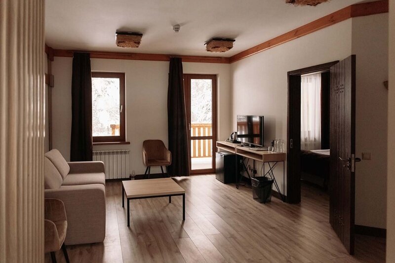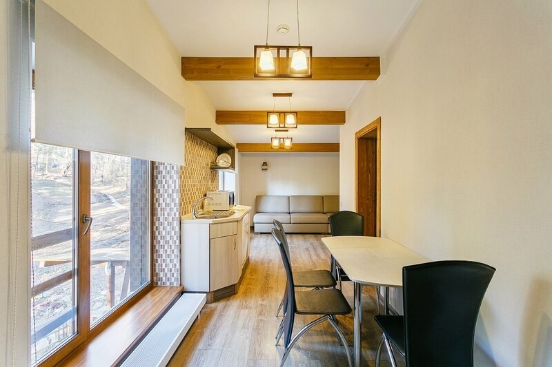 В сентябре я забронировала номер Apart с мансардой на третьем этаже 22 корпуса. Мне номер понравился, но сразу хочу предупредить: номер двухуровневый, на втором этаже спальня, взбираться туда нужно по ооочень крутой лестнице, так что внимательно посмотрите фото на сайте, по силам ли вам такой подъем. В остальном номер удобный: внизу диван, кухонная зона и то, что мне понравилось больше всего: большая открытая терраса с прекрасным видом на окрестности. На террасе столик и два удобных кресла.