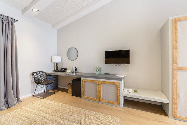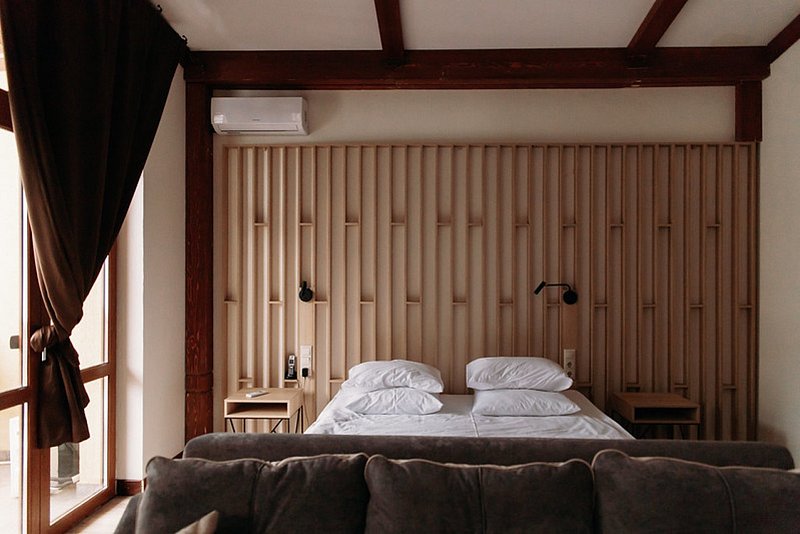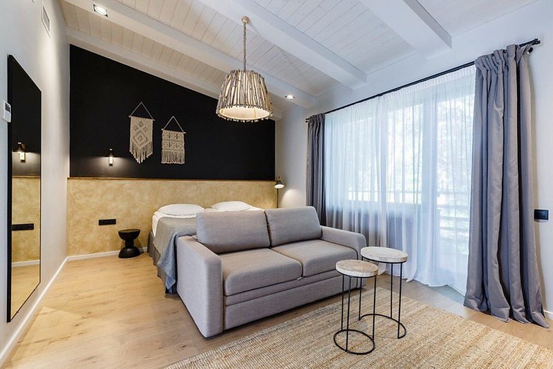 Однокомнатный номер в 11 корпусе с одной большой или двумя раздельными кроватями в современном эко-стиле с высокими потолками.