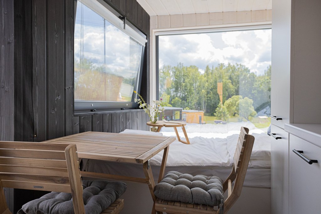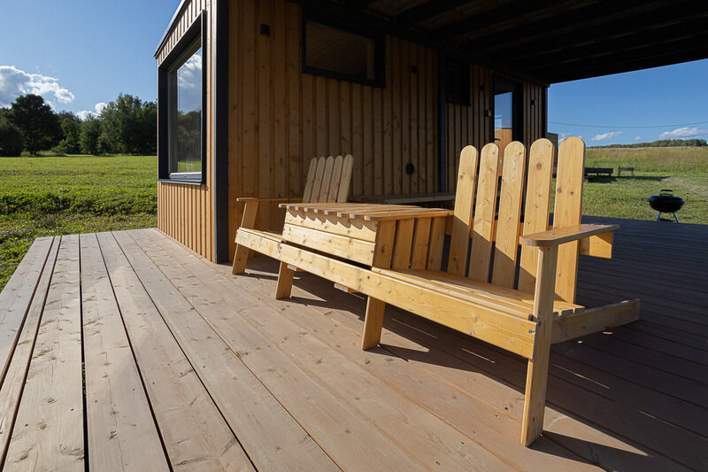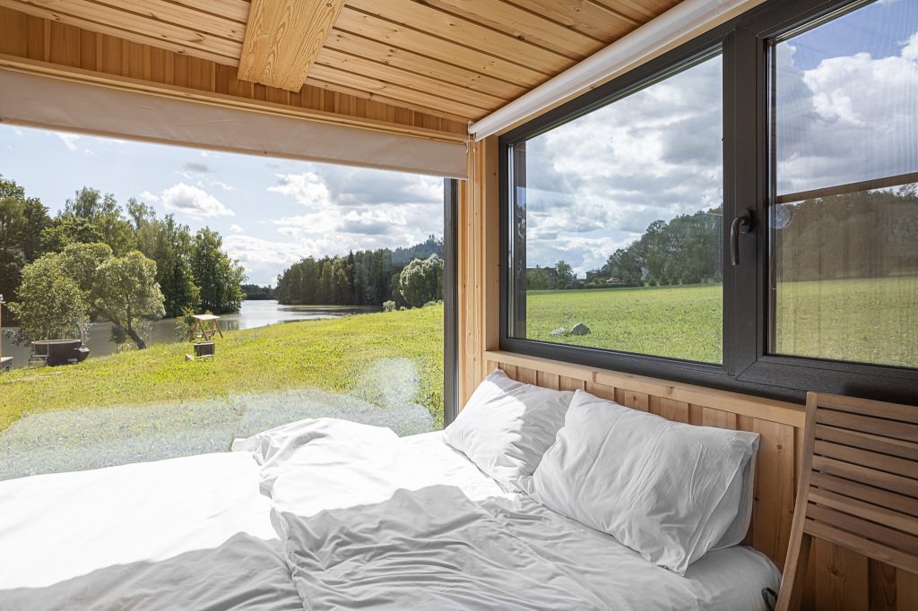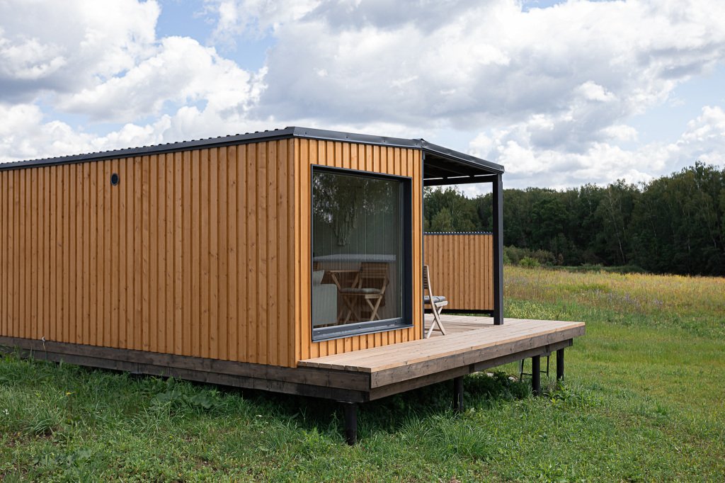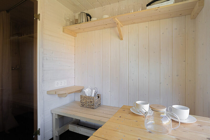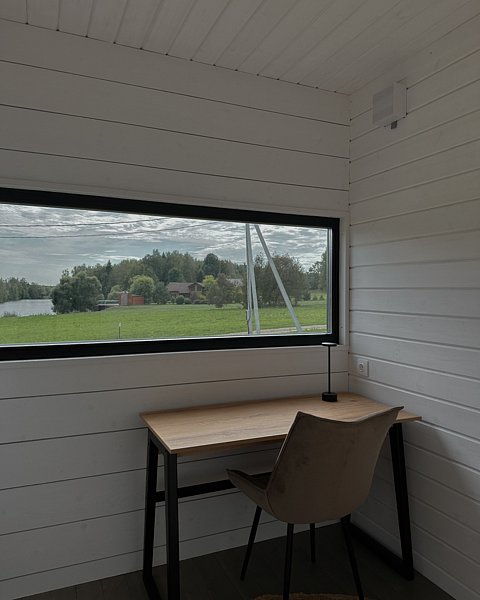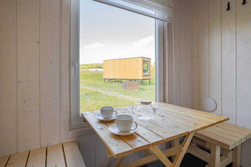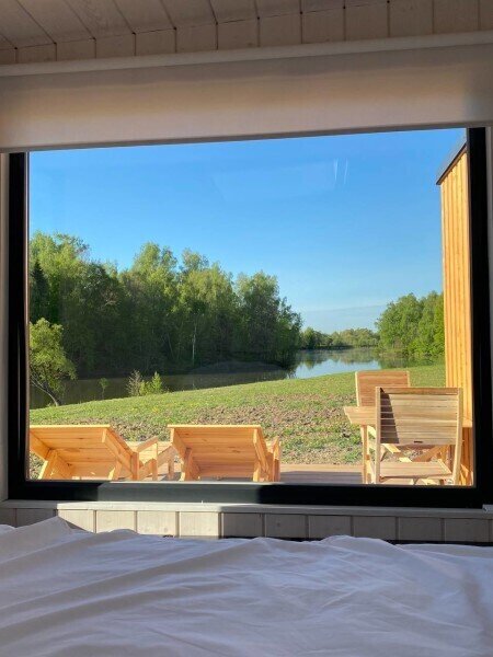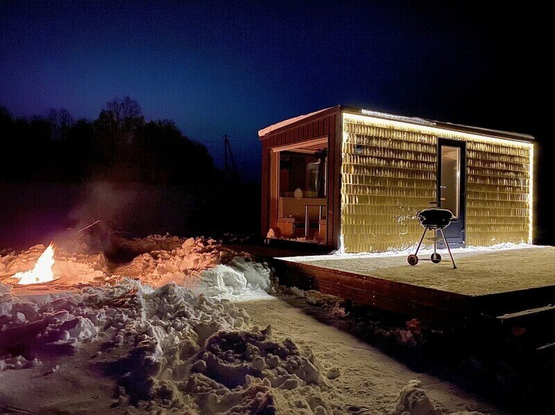 Домик расположен на берегу реки, которая берет начало прямо на территории глэмпинга! Из домика открывается панорамный шикарный вид на реку. В домике всегда тепло.