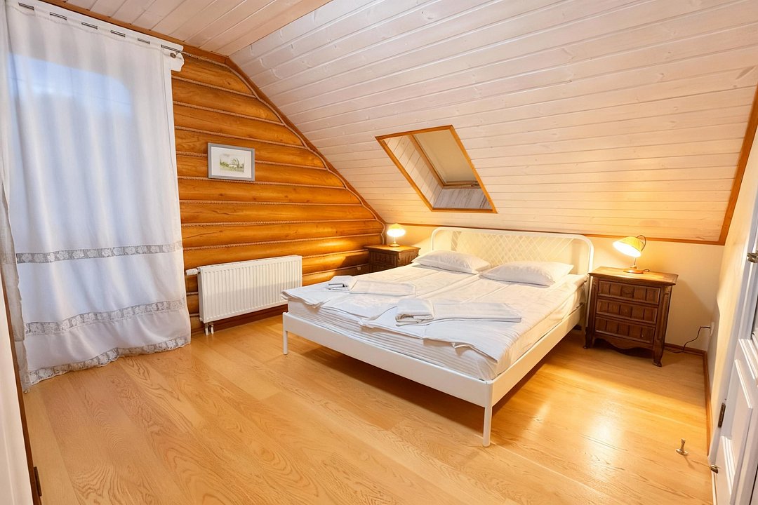 На втором этаже — две просторные комнаты с двуспальными кроватями, каждая имеет выход на балкон.