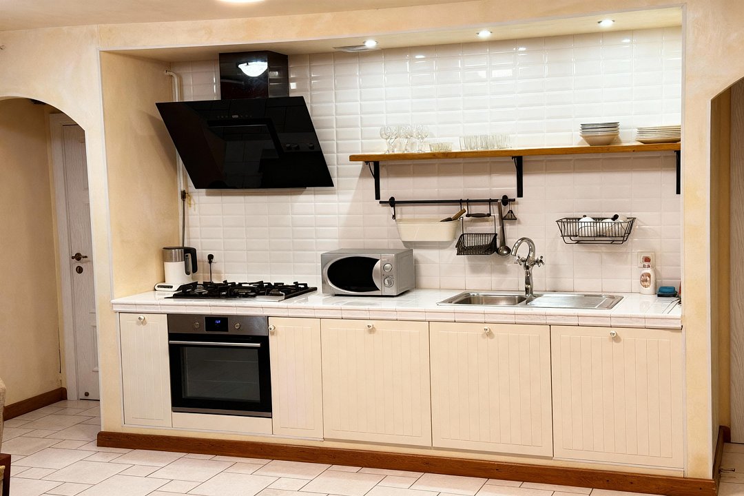 Коттедж поделен на две половины, каждая с отдельным входом и своей мангальной зоной. В доме на первом этаже расположены кухня-гостиная, оснащенная всем необходимым для комфортного проживания, санузел с ванной и стиральной машиной.