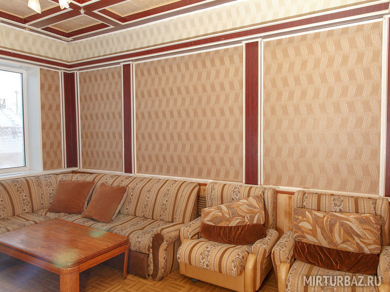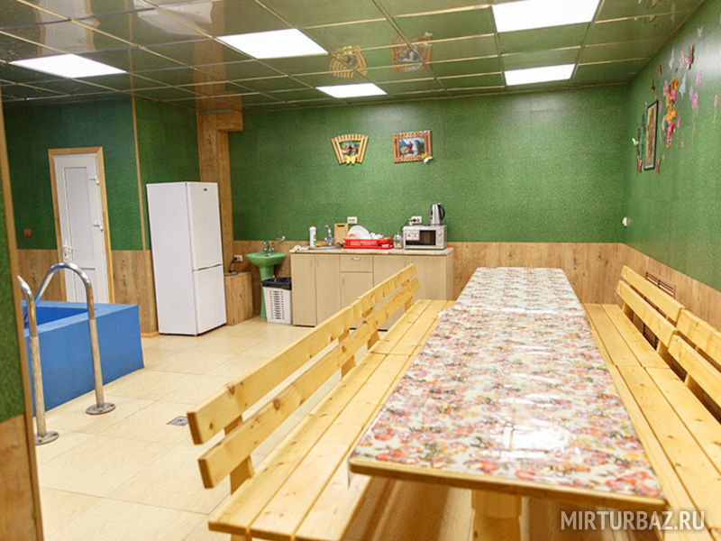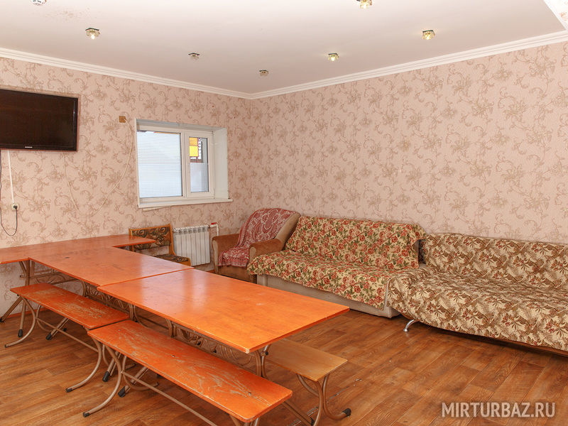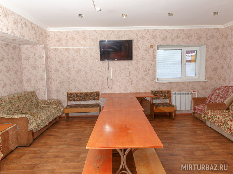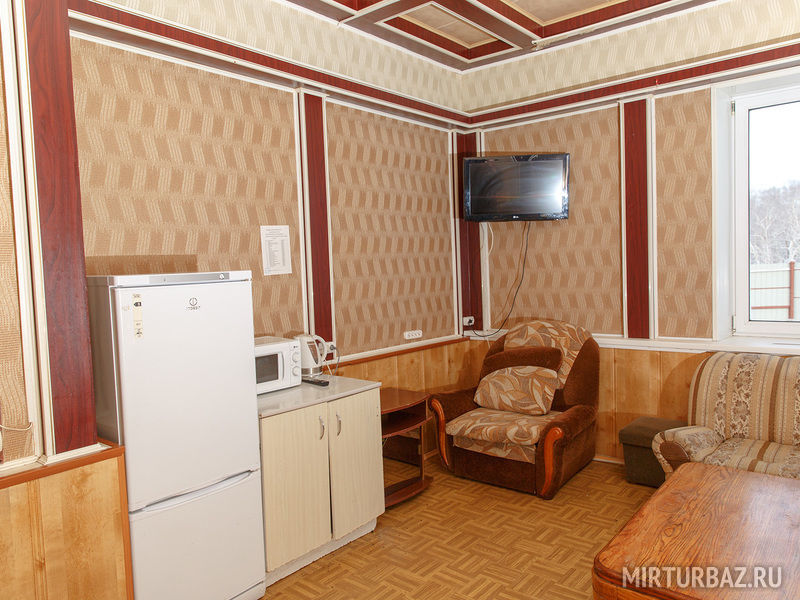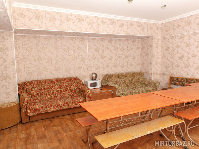 В номере: группа мягкой мебели, столы длинные с лавочками, кресла, тумбочка, холодильник, электрический чайник, микроволновка, телевизор, санузел.
