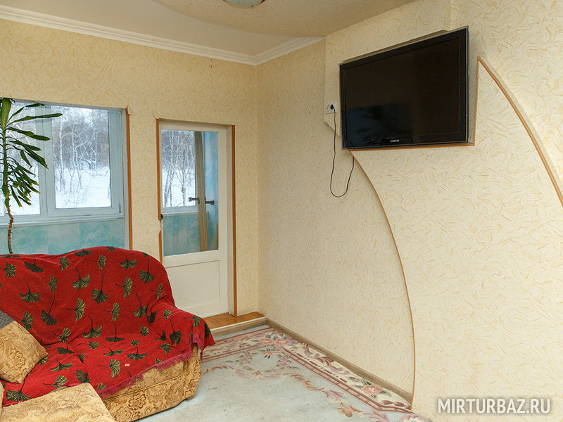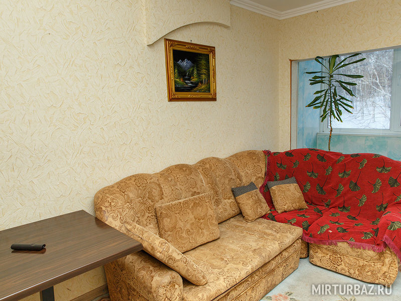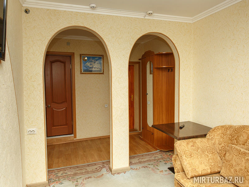 В номере: диван угловой, двуспальная кровать, кресла, тумбочка, холодильник, электрический чайник, микроволновка, телевизор, санузел.