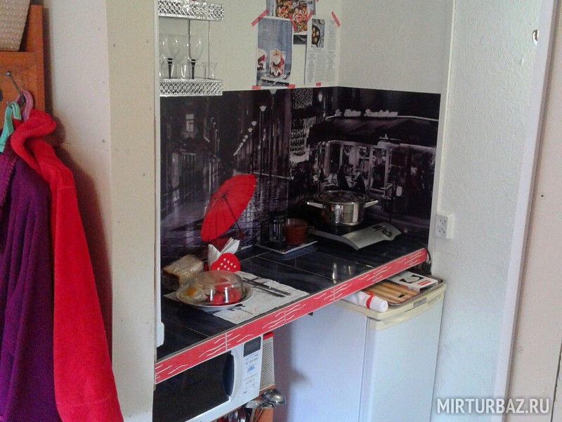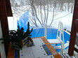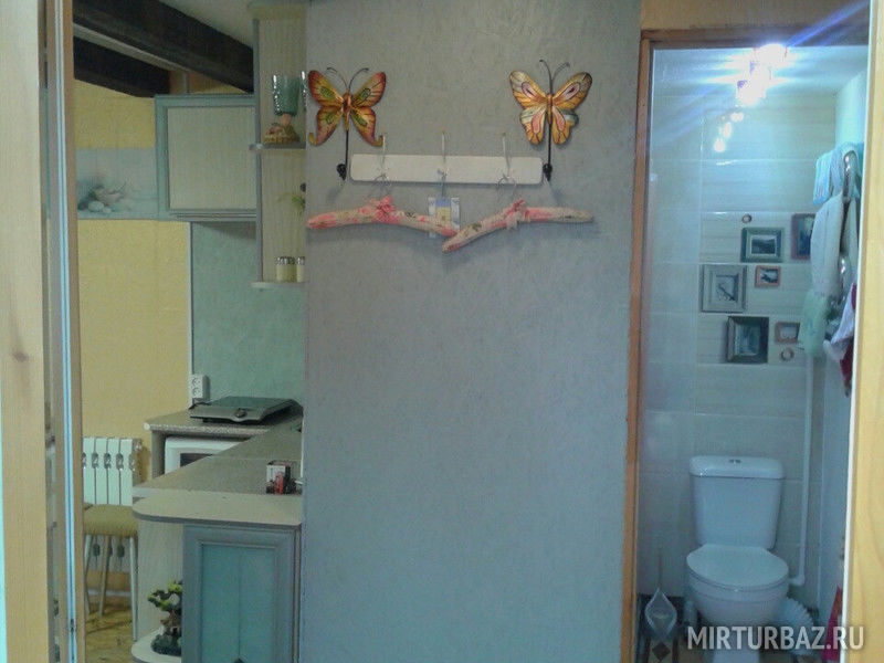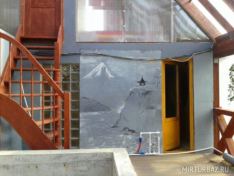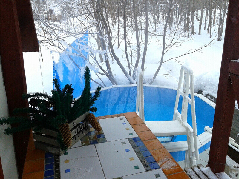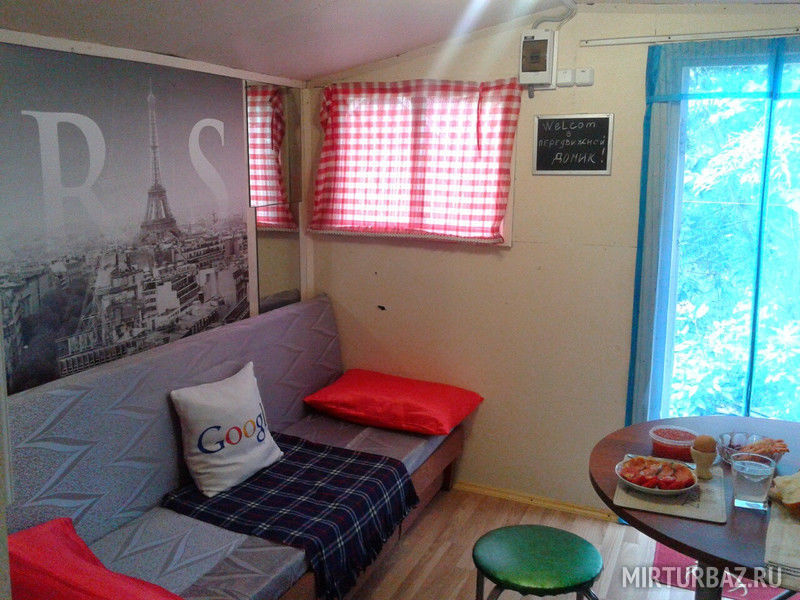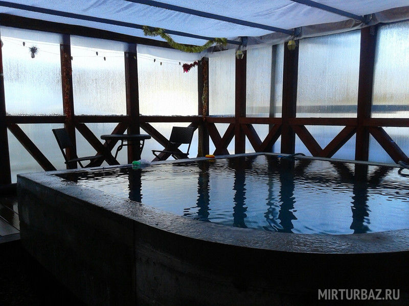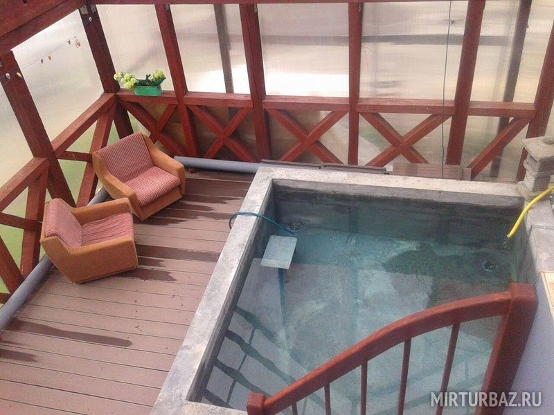 В двухэтажном доме: спальня на 2 этаже (кровати можно сдвигать), гостиная с кухней (теплый пол), душ, туалет. Бассейн с термальной водой возле крыльца. Дом с европейским интерьером.