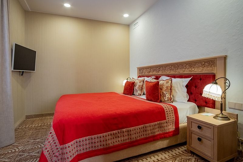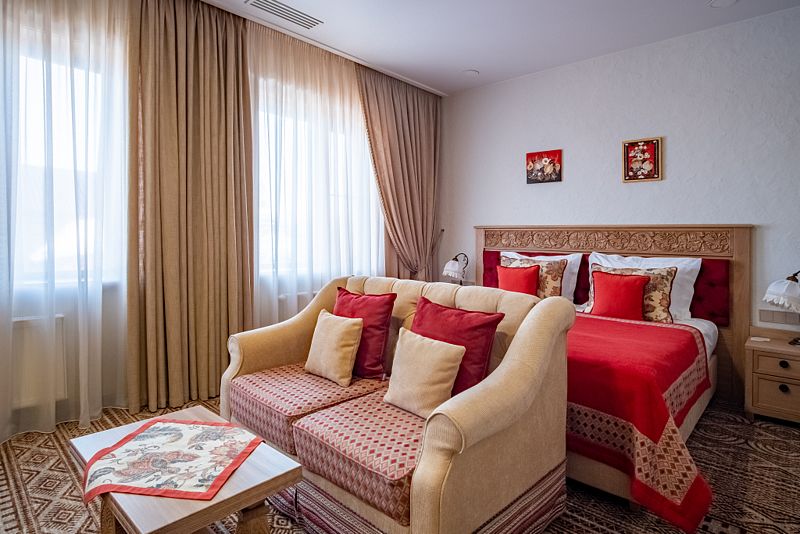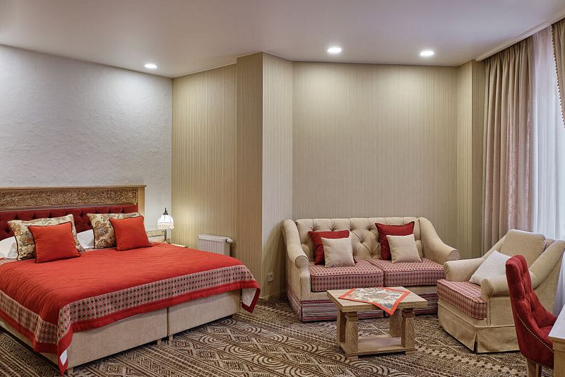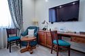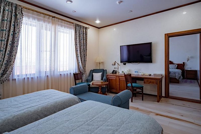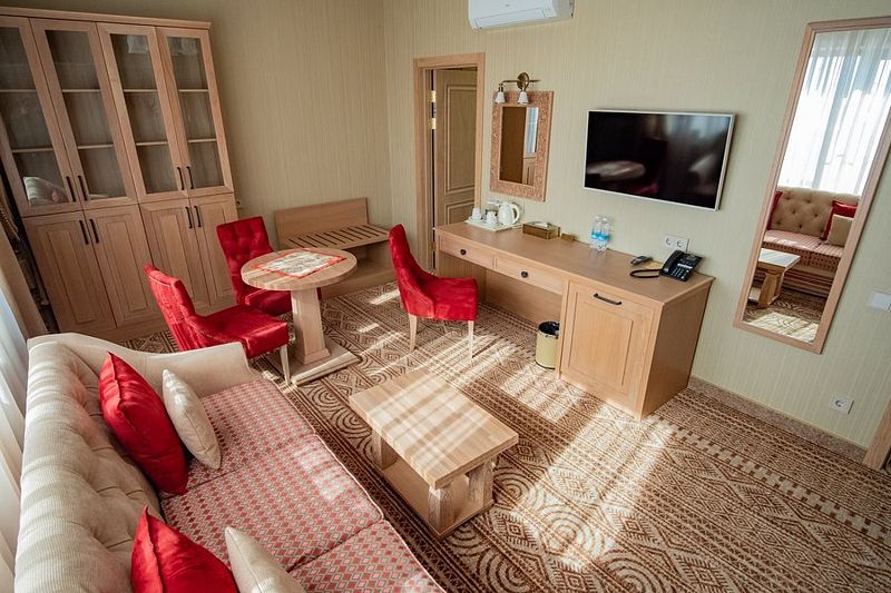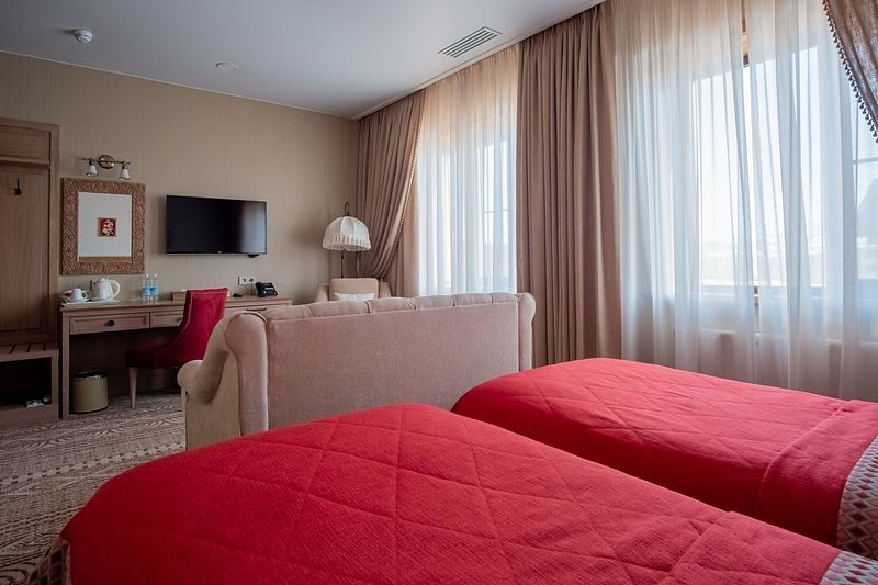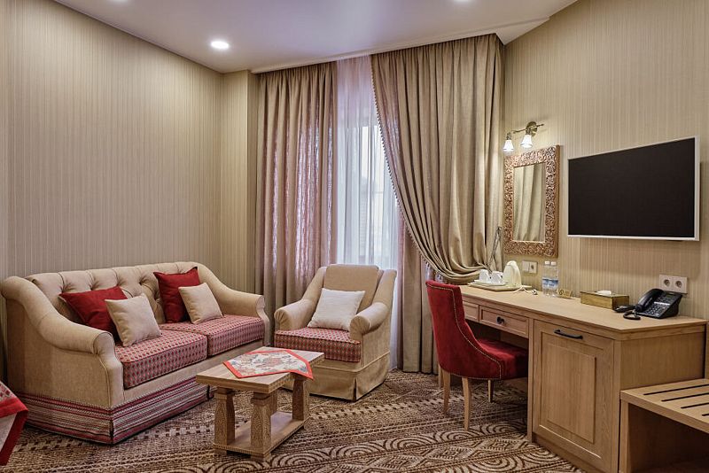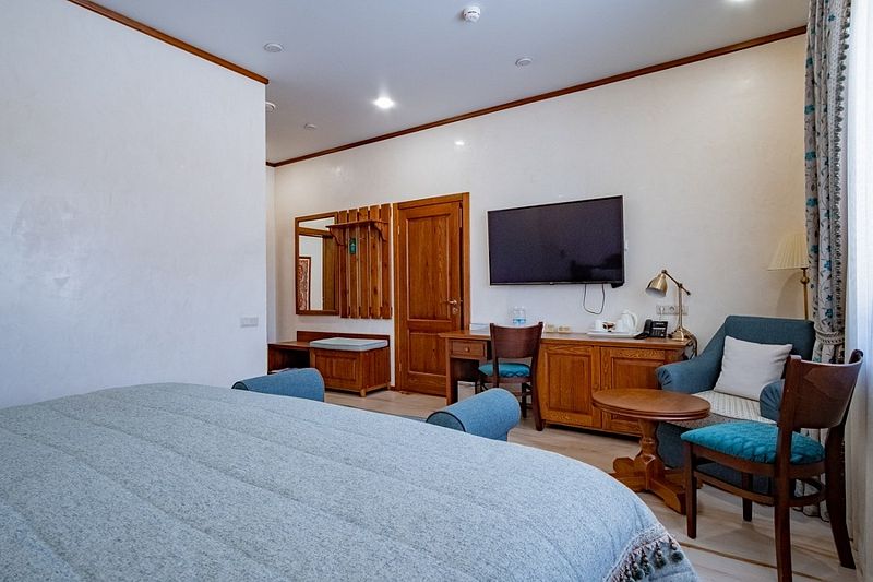 Номер уютно обставлен и оснащён необходимым, чтобы отдохнуть после долгого и насыщенного дня. Имеется халат. Оснащение зависит от выбранной категории номера.
