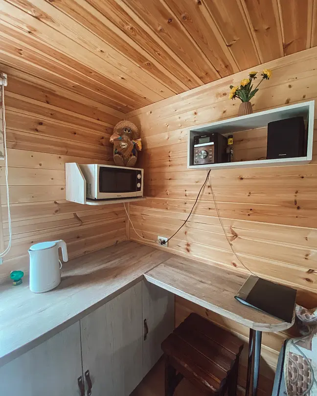 На 1 этаже расположена комната отдыха с кухней и парилка (баня на дровах).