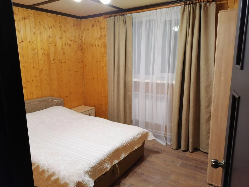 На втором этаже находятся шкаф и 4 отдельные комнаты. В каждой комнате имеется 2х-спальная кровать 160х200, прикроватные тумбы, на окнах шторы с высокой степенью затенения. Все кровати оснащены постельными принадлежностями, подушки из лебяжьего пуха. Предлагаемое к использованию постельное белье изготовлено из хлопкового сатина.