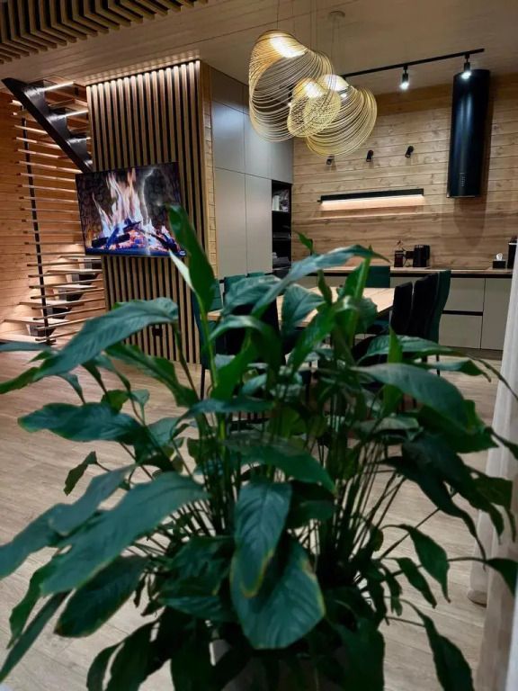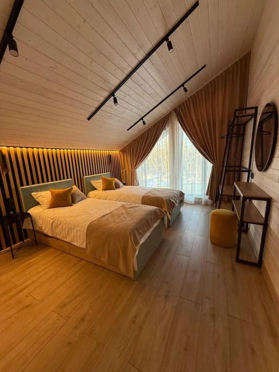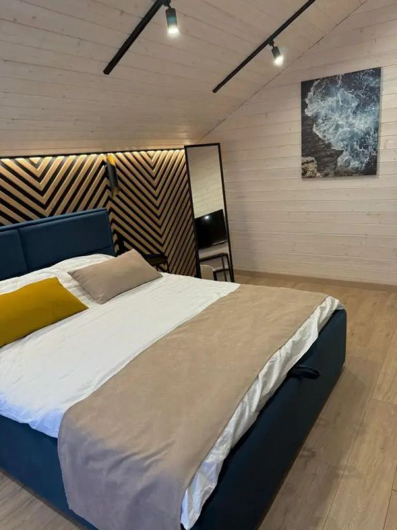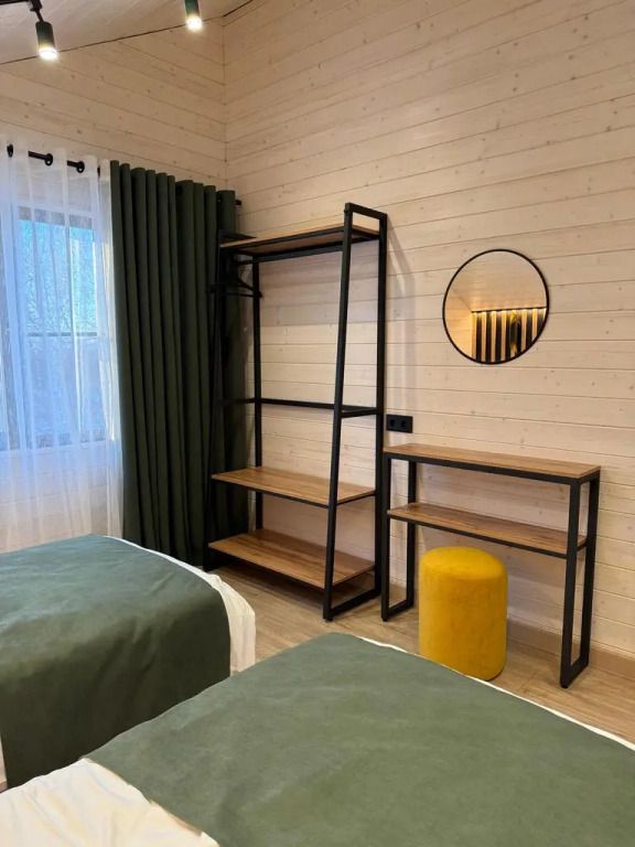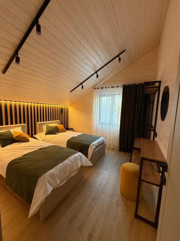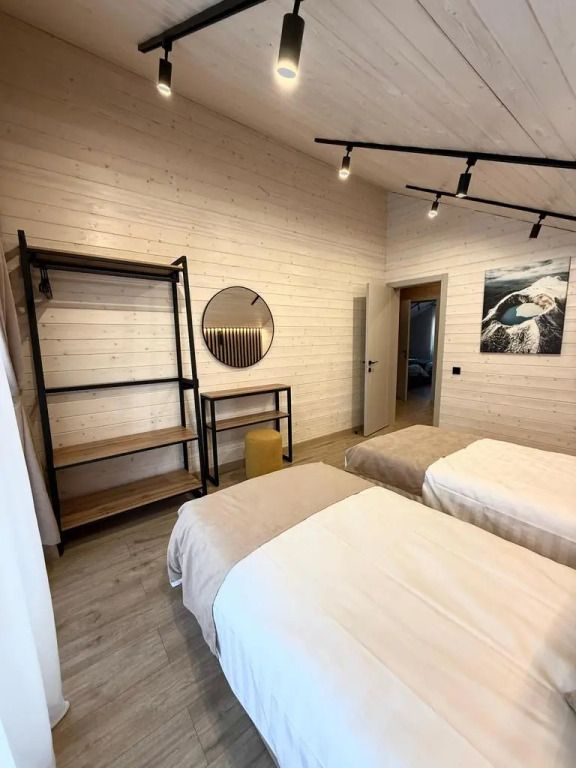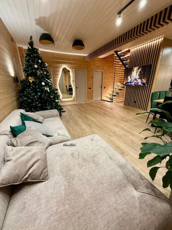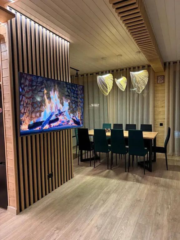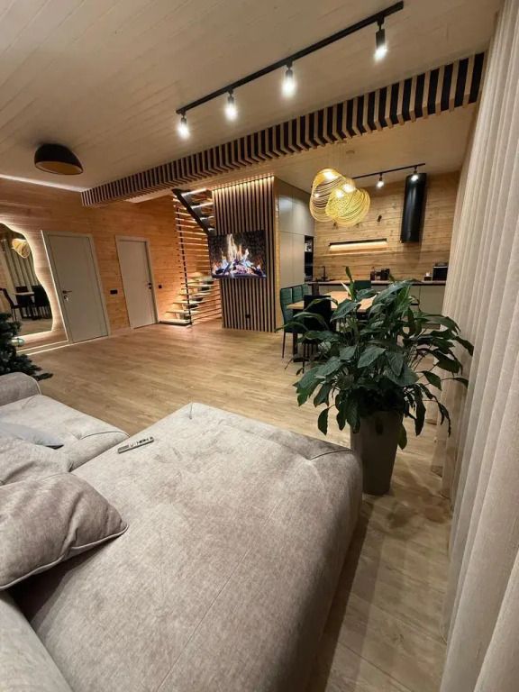 Площадь дома составляет 150 кв.м, он оборудован панорамными окнами и террасой. Дом находится на участке площадью 2000 кв.м на закрытой территории. На территории имеется банный чан и мангал-барбекю на углях. Возможно размещение до 10 гостей в отдельных спальнях, также предусмотрены дополнительные спальные места в гостиной на диване для двух человек.