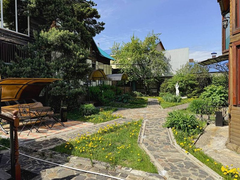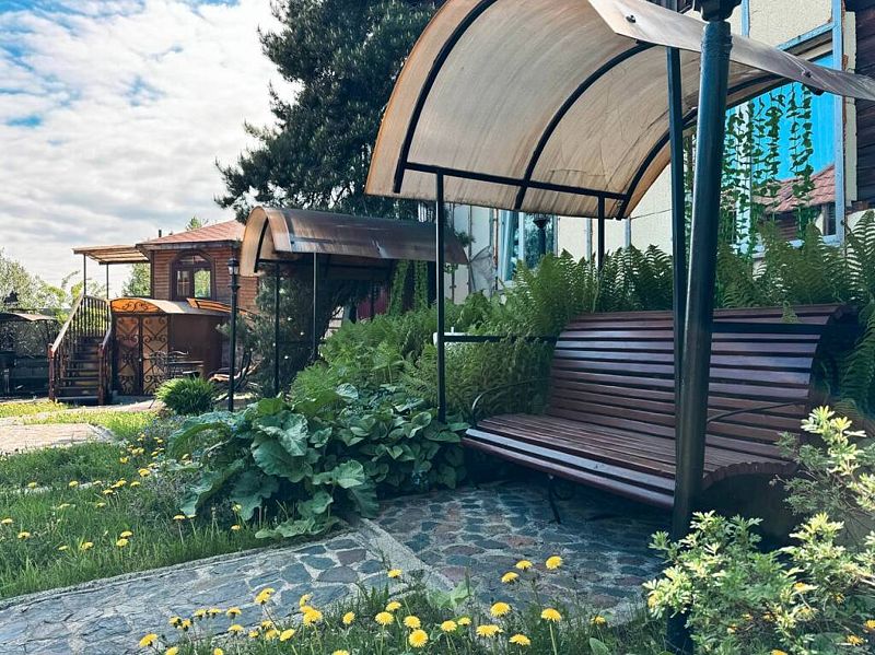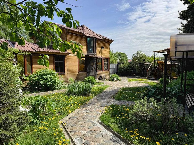 Двухэтажный дом с частной территорией, парковкой, беседками, с баней и бассейном.