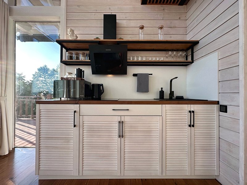 На первом этаже располагается уютная кухня-гостиная, ванная комната, хозяйственная комната со стиральной машиной и спальня с большой двухспальной кроватью. Зона кухни оборудована всей необходимой посудой и бытовой техникой. В зоне гостиной – раскладывающийся диван.