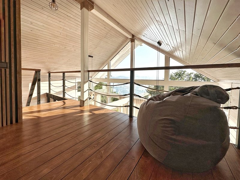Главная особенность дома – панорамная терраса с мебелью площадью 75 кв. м, откуда открывается прекрасный вид.