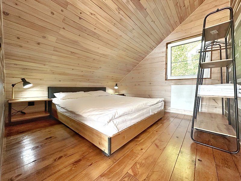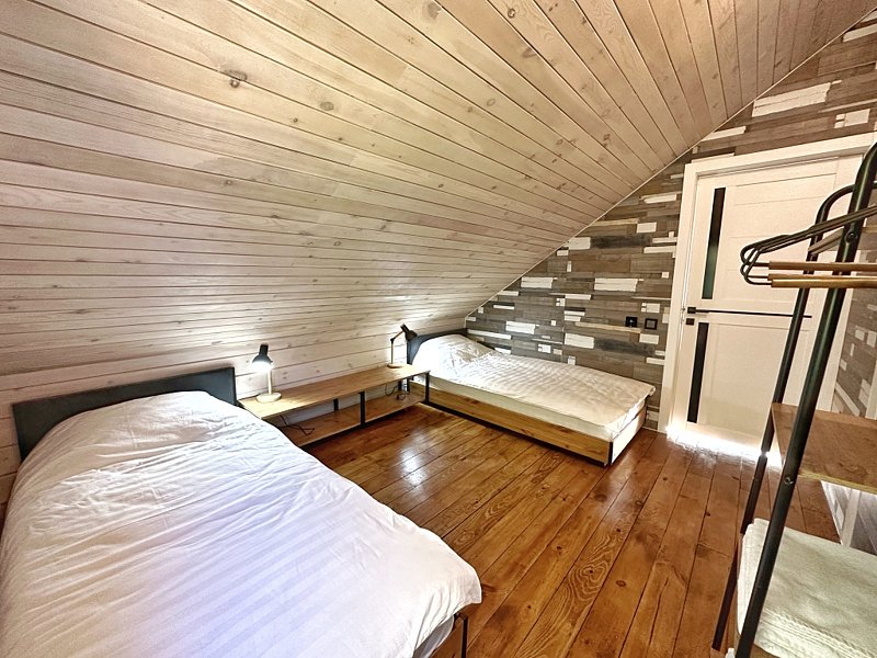 На втором этаже – две спальни с двухспальной и односпальными кроватями. Для поддержания оптимальной температуры дом снабжен сплит-системой и конверторными батареями.