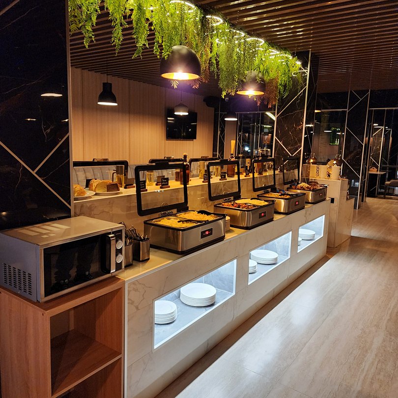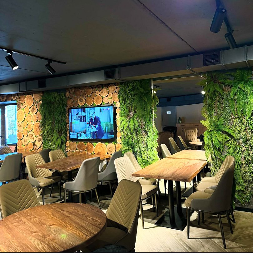 Основной ресторан удобно расположен на первом этаже здания, площадью 140 м² с возможностью одновременной посадки до 80 человек.