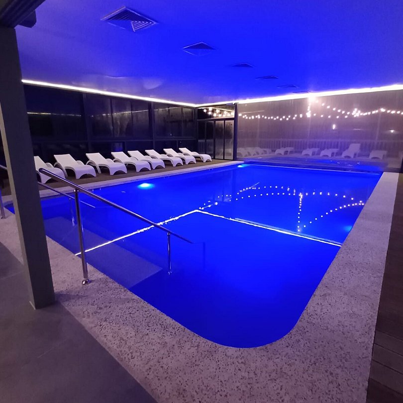 10 метров бассейна находится в отапливаемом остекленном помещении, боковая часть которого в летнее время открывается, а 5 метров бассейна круглогодично находится под открытым небом.