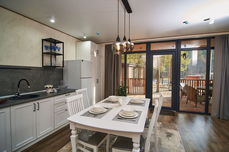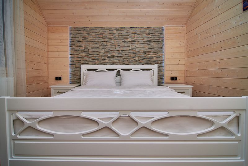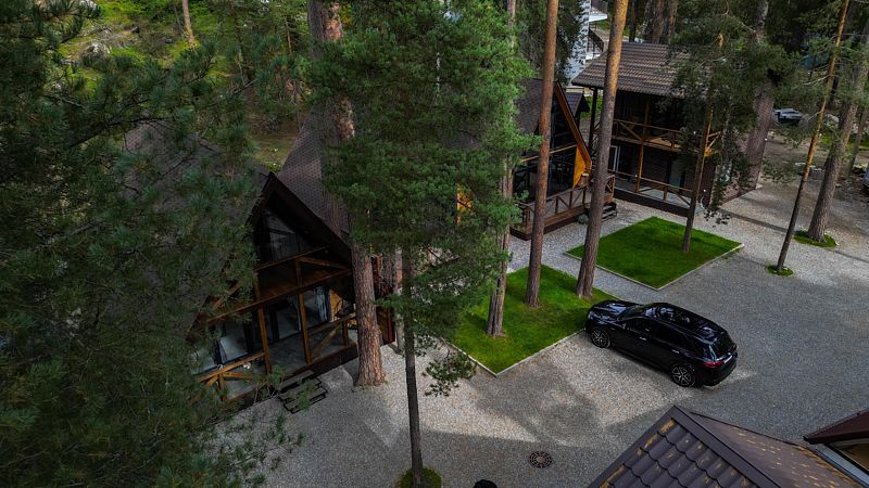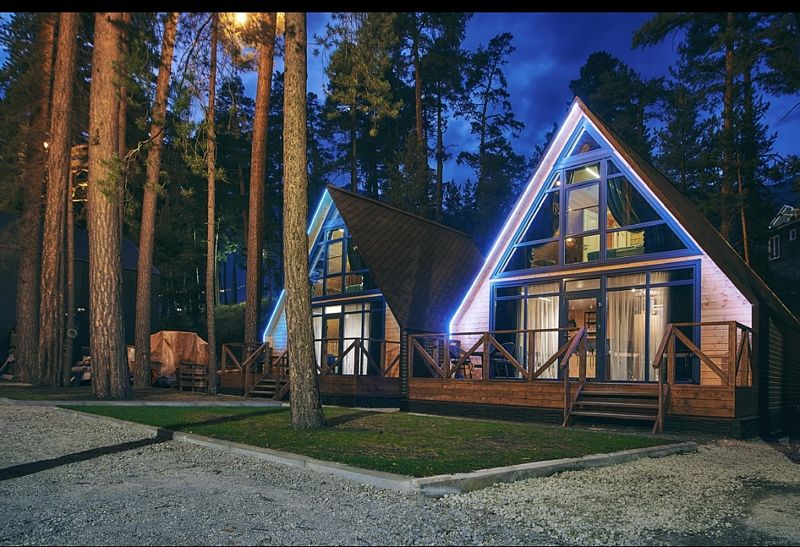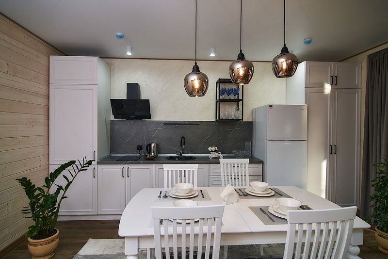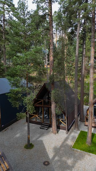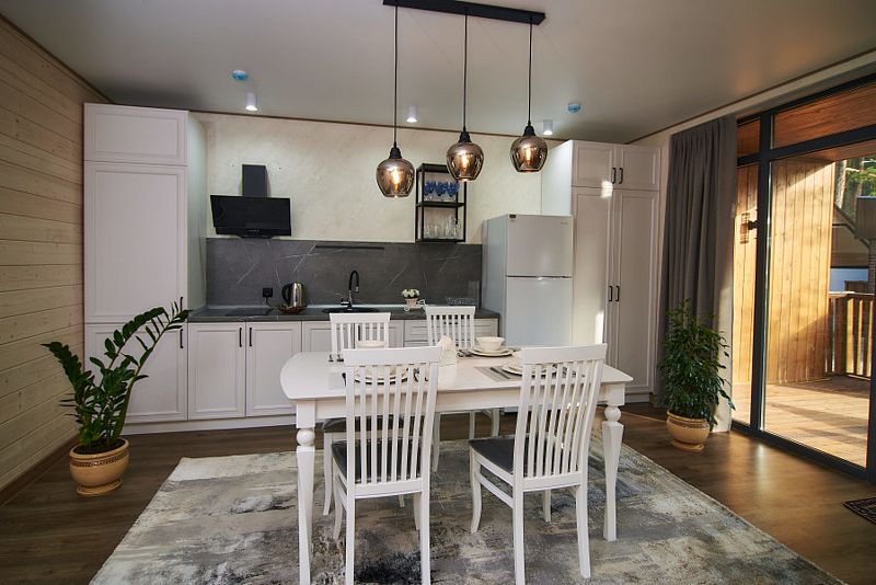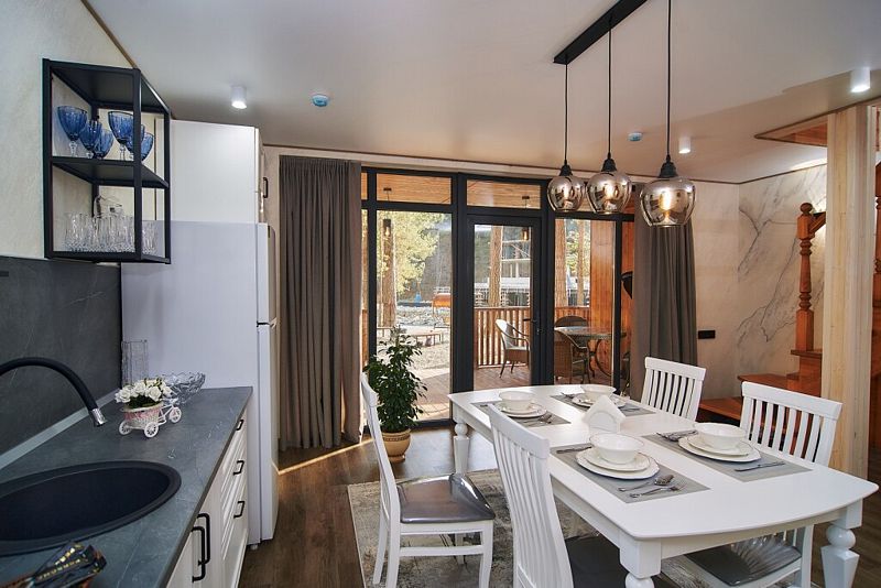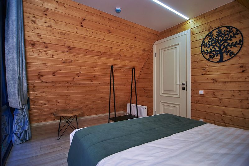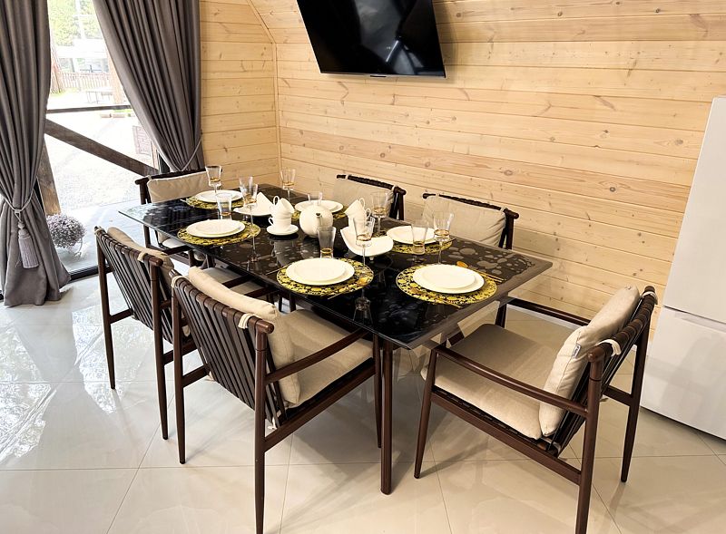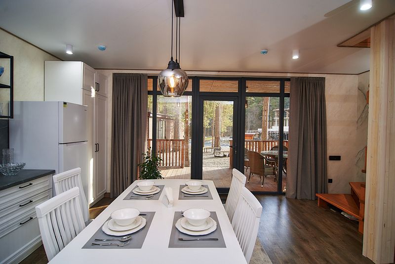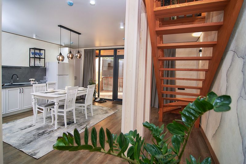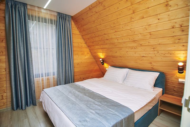 Предлагаемые домики типа «A-frame» и «Барнхаус» выполнены из натурального дерева и обеспечивают полный комфорт. Они оснащены шумоизоляцией и системой отопления с теплым полом. Внутри предоставлены все удобства для самостоятельного приготовления пищи: оборудованная кухня с бытовой техникой и посудой.