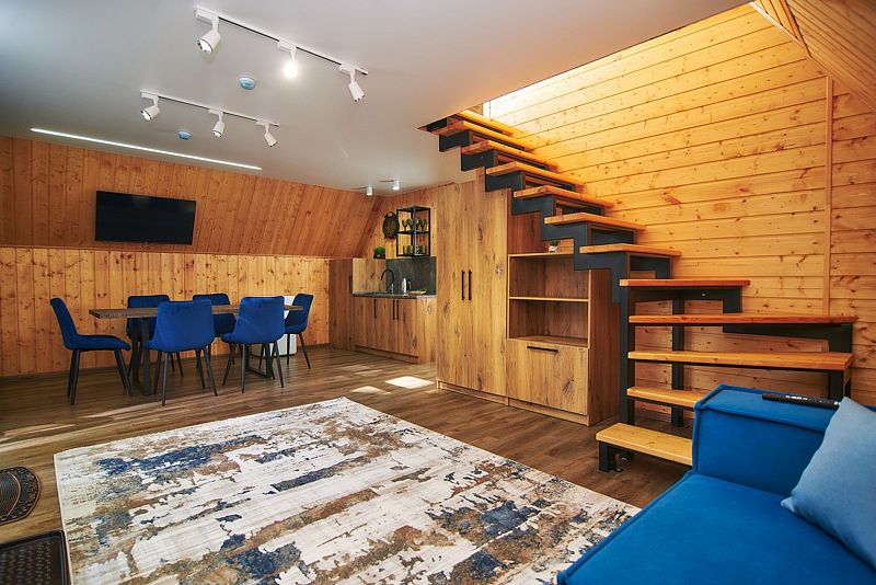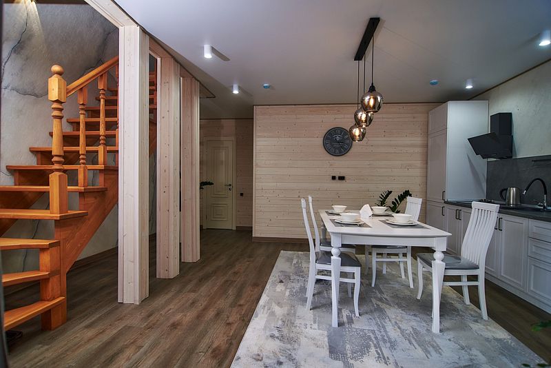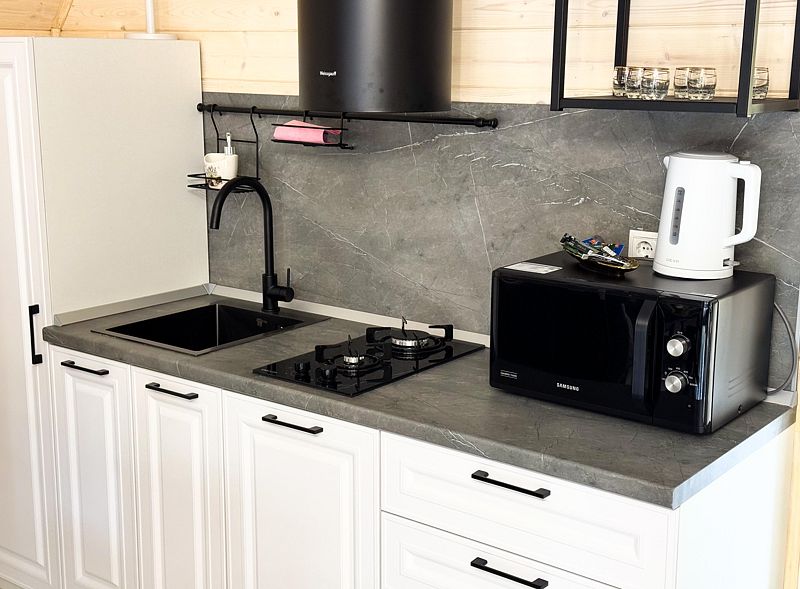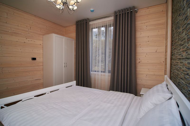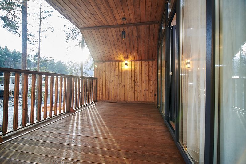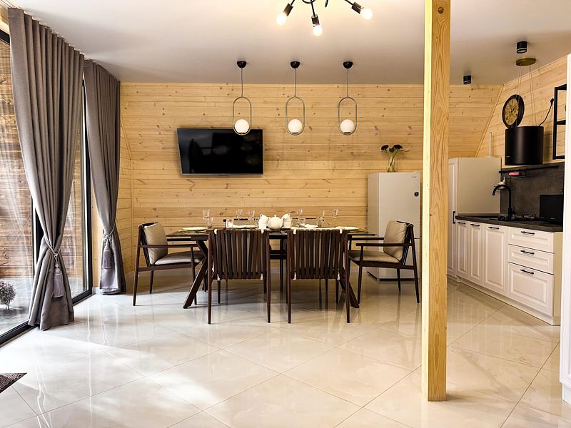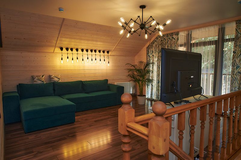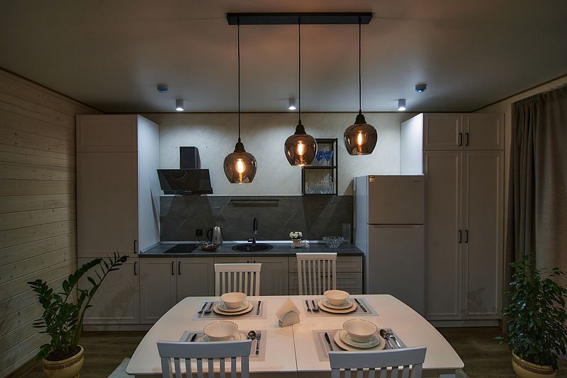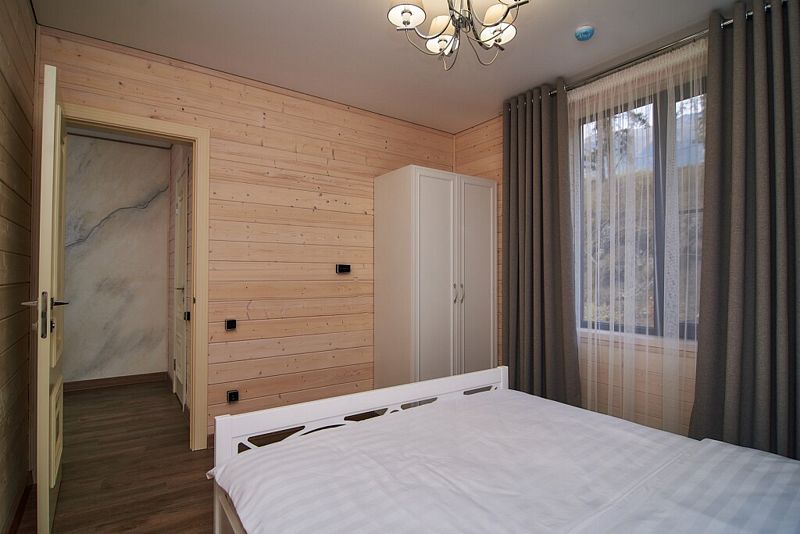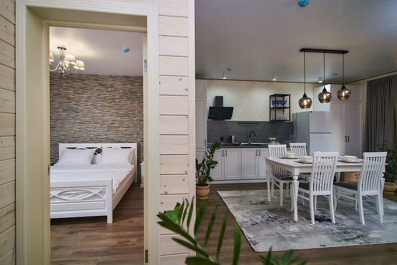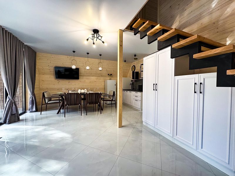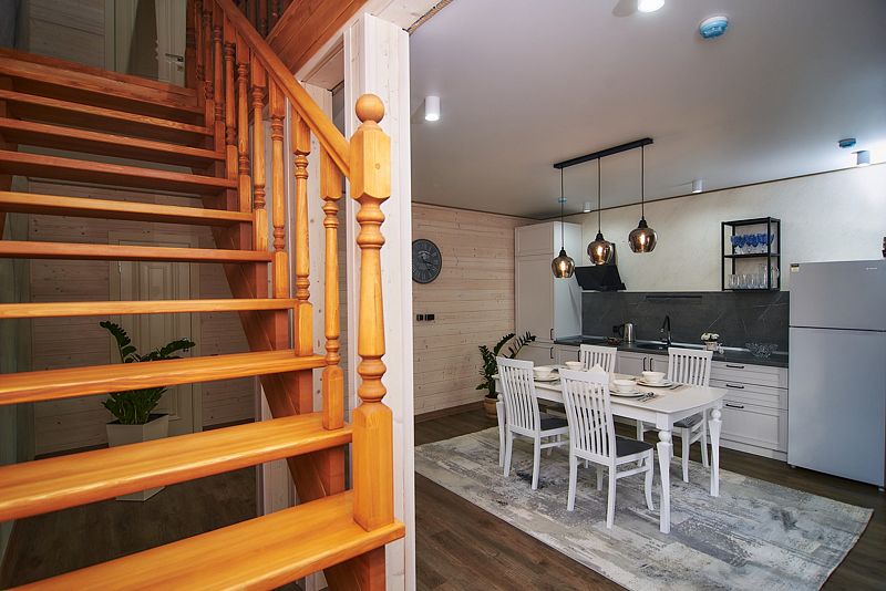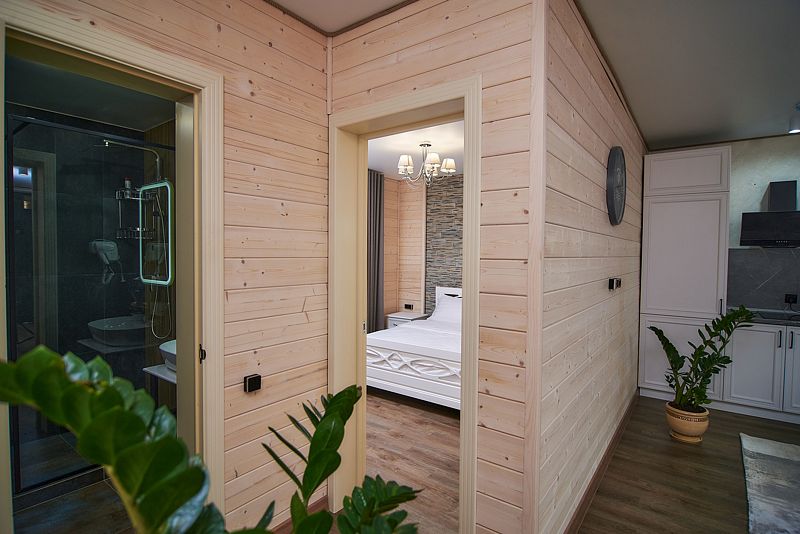 Предлагаемые домики типа «A-frame» и «Барнхаус» выполнены из натурального дерева и обеспечивают полный комфорт. Они оснащены шумоизоляцией и системой отопления с теплым полом. Внутри предоставлены все удобства для самостоятельного приготовления пищи: оборудованная кухня с бытовой техникой и посудой.