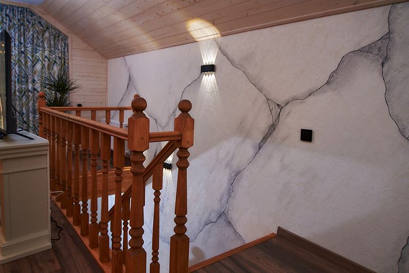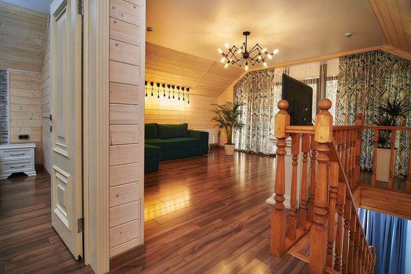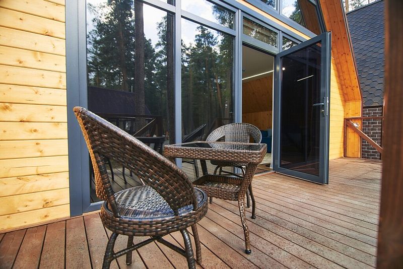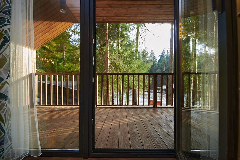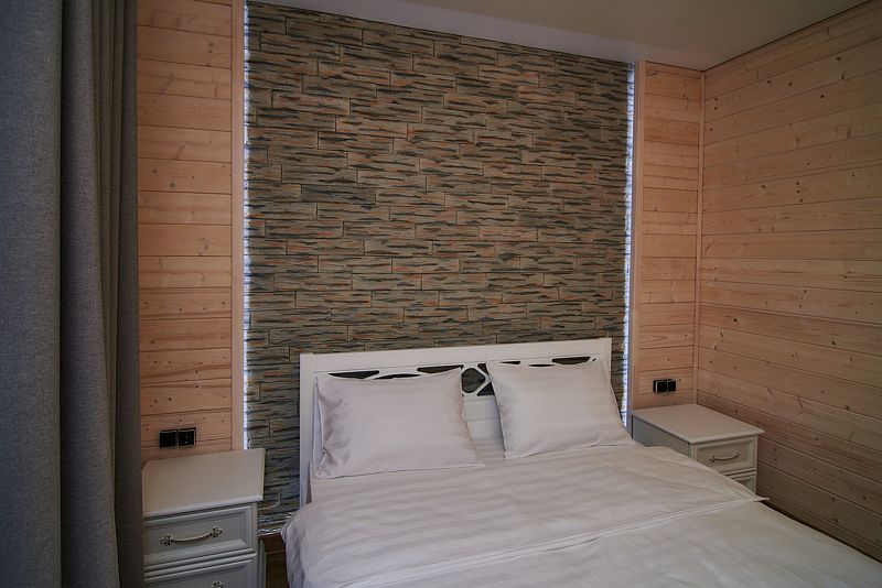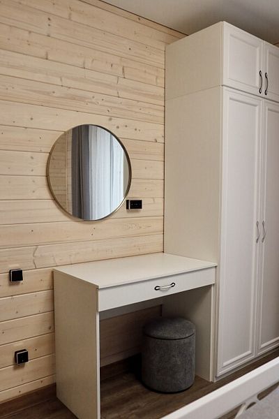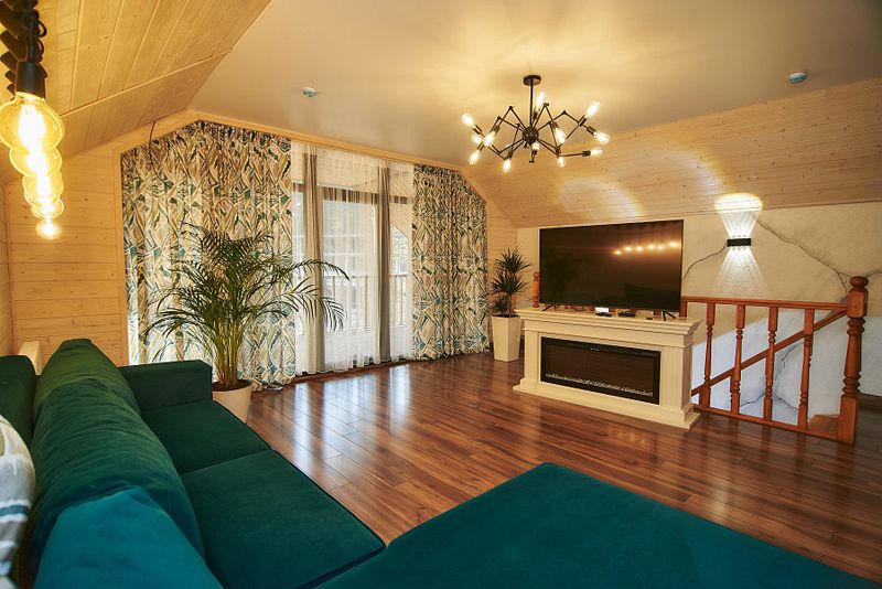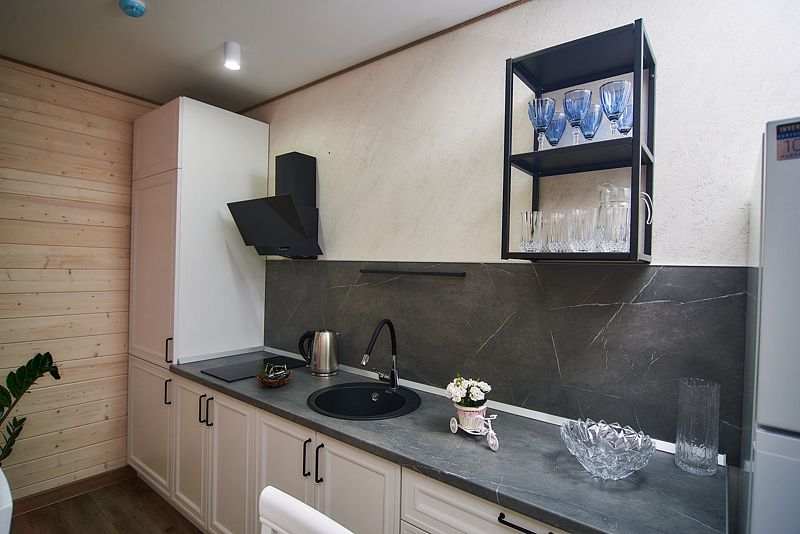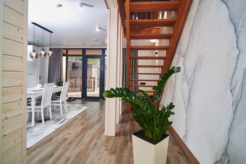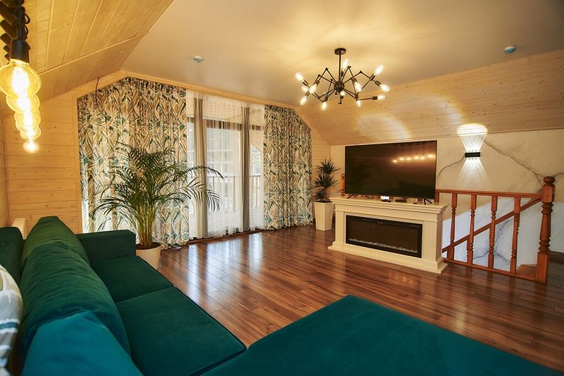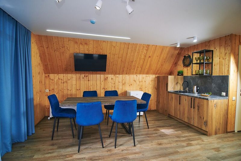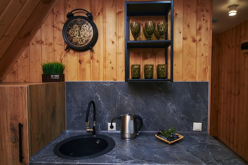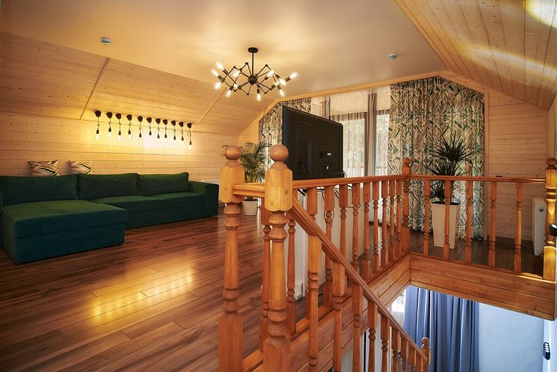 Предлагаемые домики типа «A-frame» и «Барнхаус» выполнены из натурального дерева и обеспечивают полный комфорт. Они оснащены шумоизоляцией и системой отопления с теплым полом. Внутри предоставлены все удобства для самостоятельного приготовления пищи: оборудованная кухня с бытовой техникой и посудой.