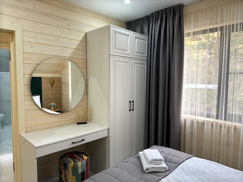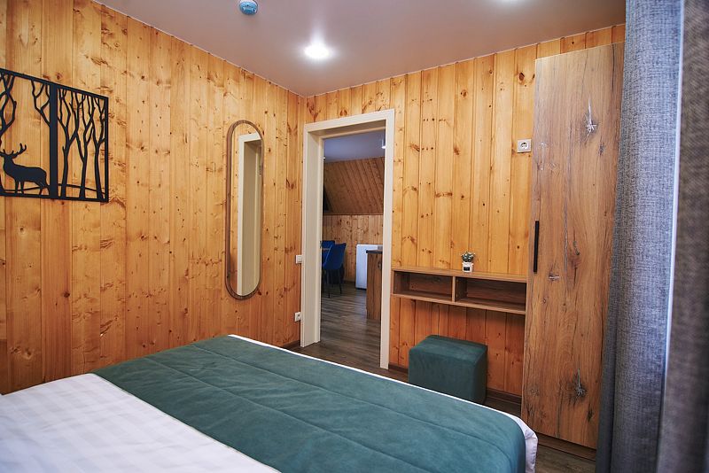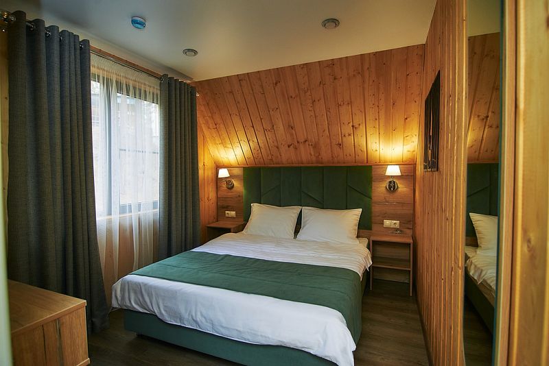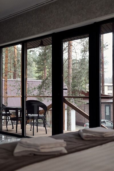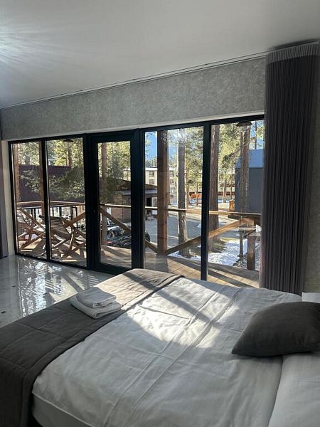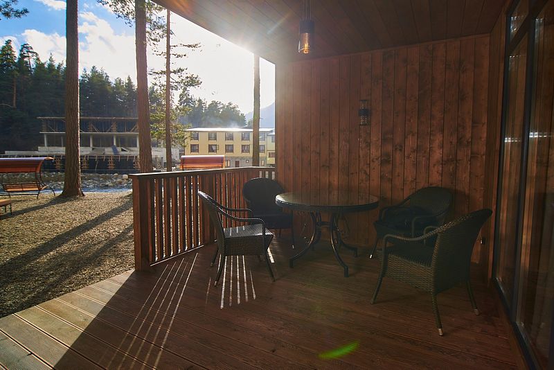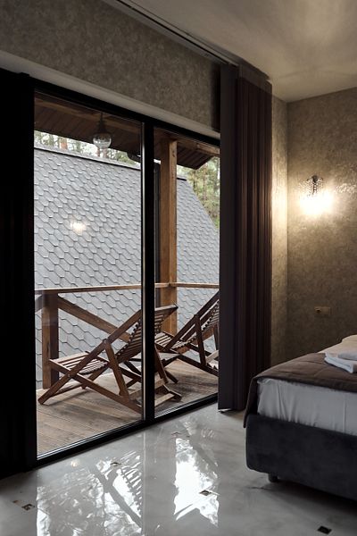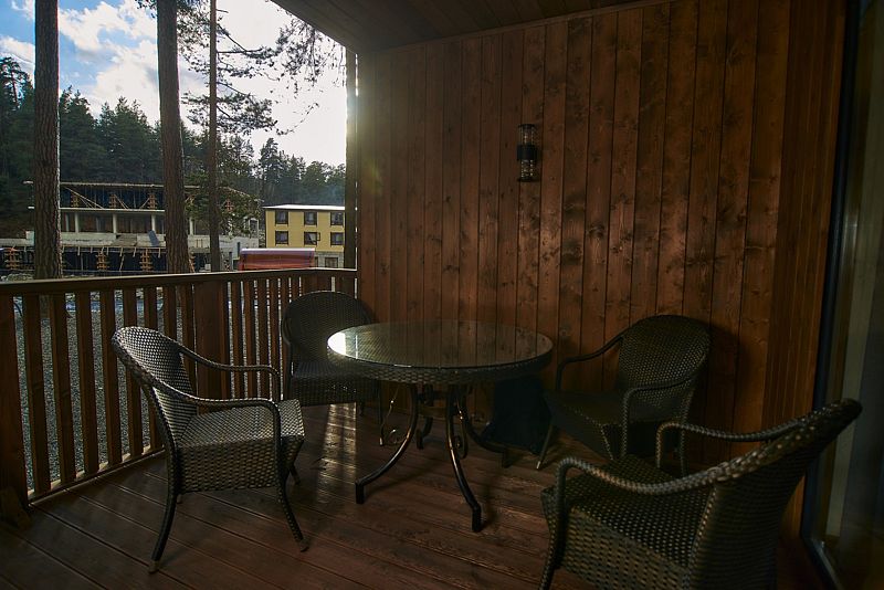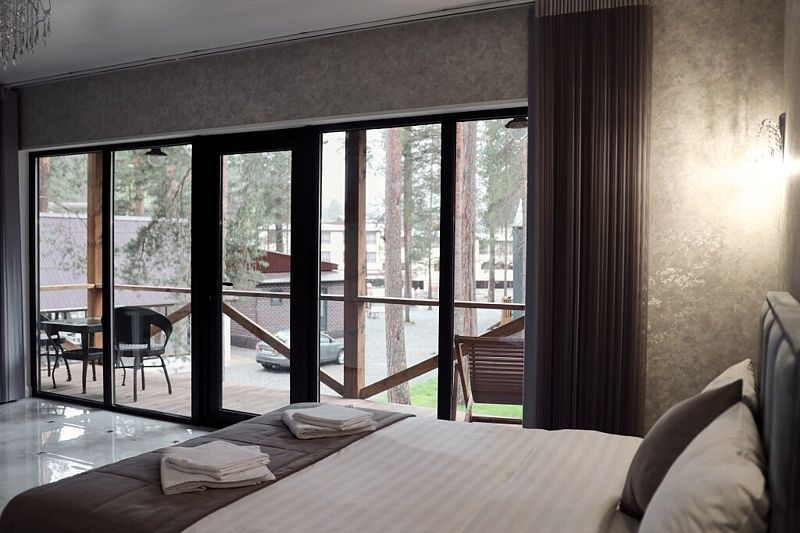 Светлый, просторный, современный номер категории Люкс с балконом, из которого открывается красивейший вид на лес, речку и горы.