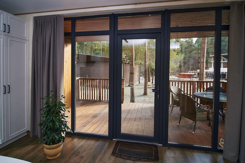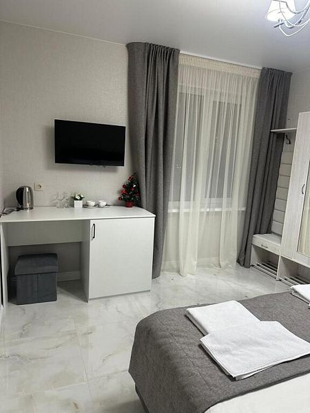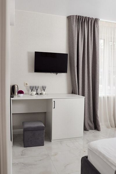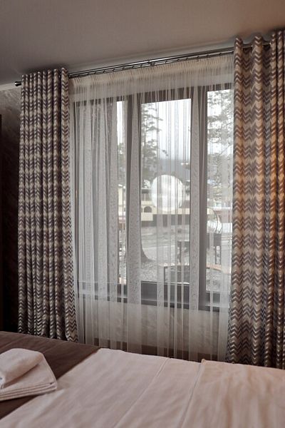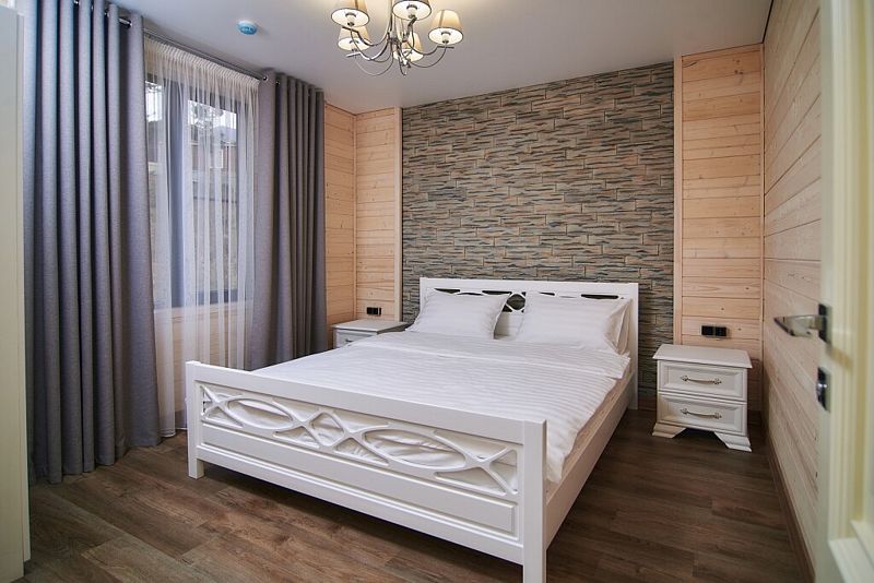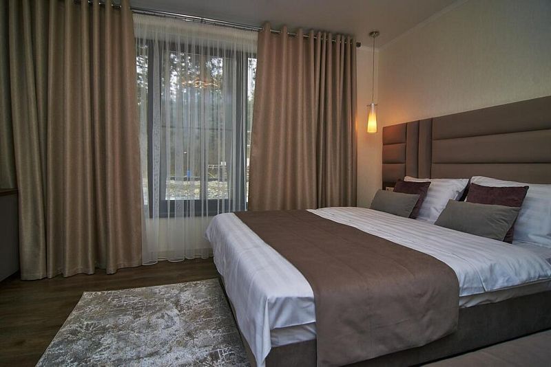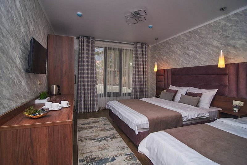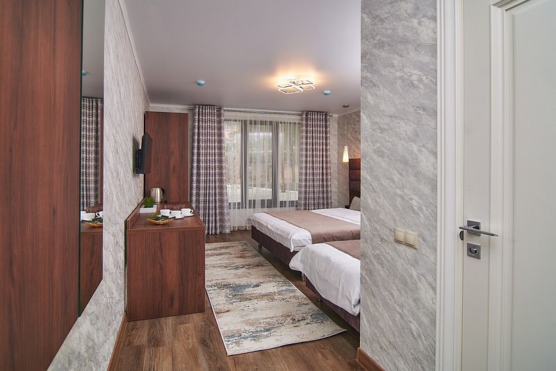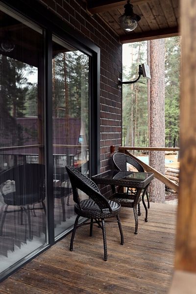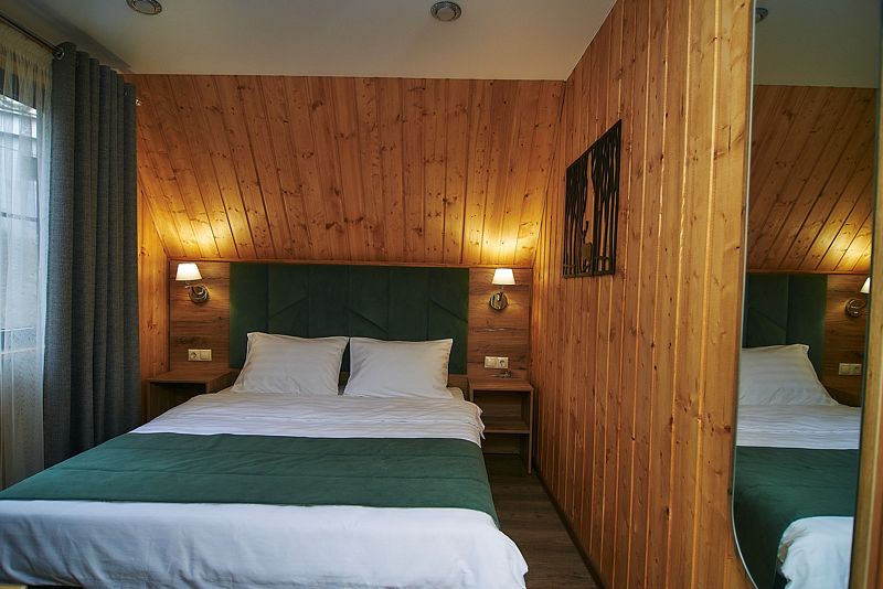 Светлый, просторный, современный номер категории Люкс с балконом, из которого открывается красивейший вид на лес, речку и горы.