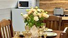 - кухня-гостиная: кухонный гарнитур, чайник, холодильник, микроволновая печь,плита,посуда,стол, стулья, двуспальный диван, телевизор, совмещённый санузел;