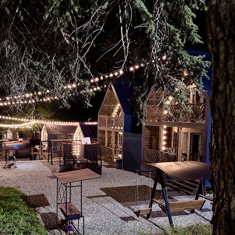 На территории: мангальные зоны, очаговая зона, детская площадка, беседка, качели, батут, горный ручей.