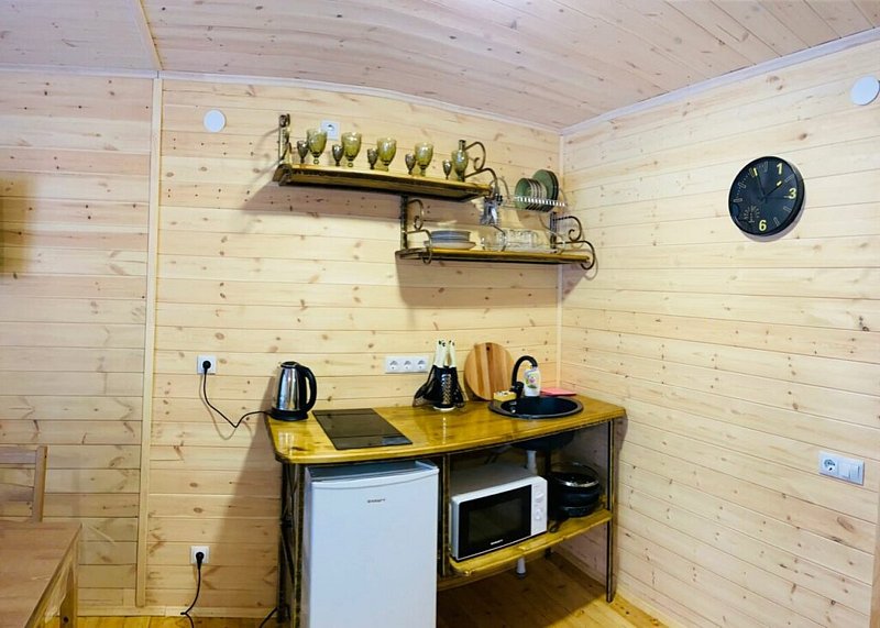 В доме одна изолированная спальня, гостевая кухня, душевая комната. Релакс диван на двух человек, кресло кровать на 1 человека, в спальне — двуспальная кровать ручной работы с ортопедическим матрасом.
