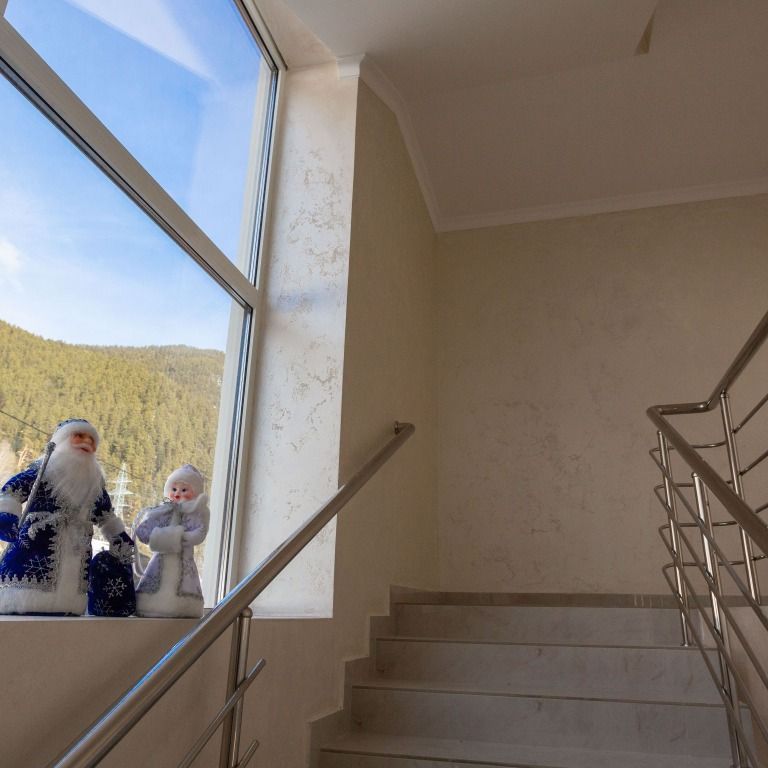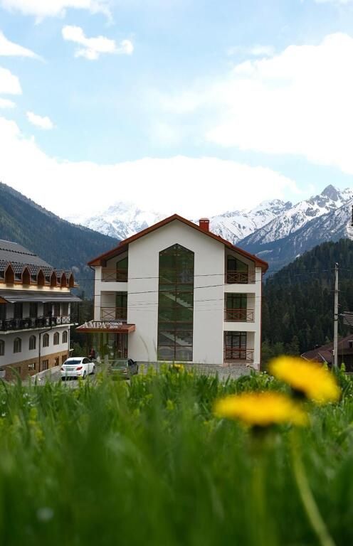 Трехэтажная гостиница находится в живописном месте поселка, откуда открываются панорамные виды на Кавказские вершины.