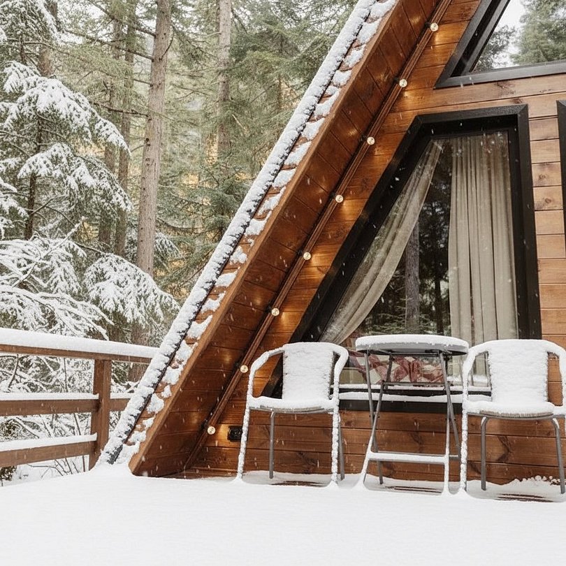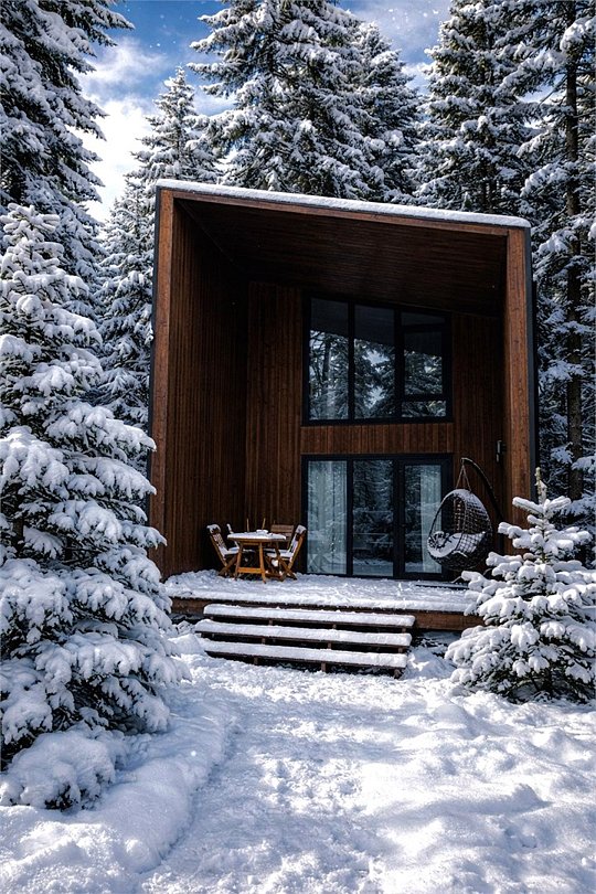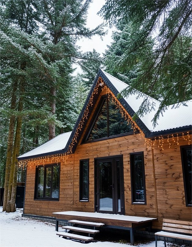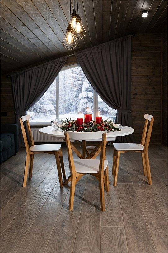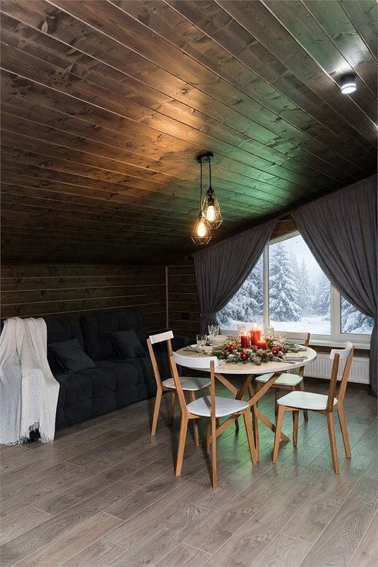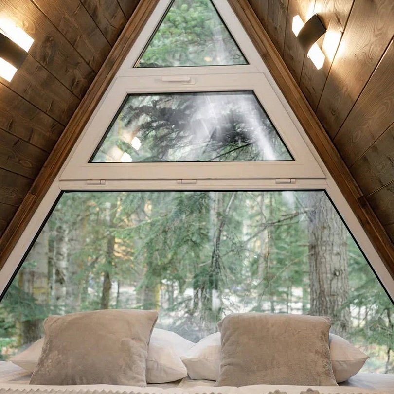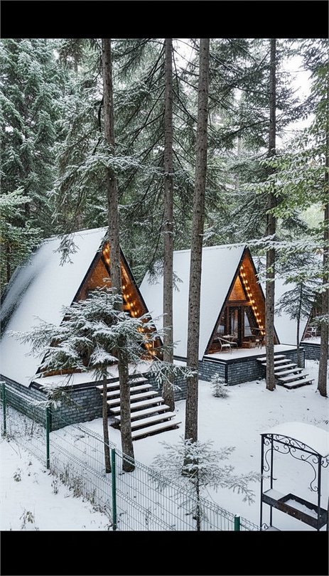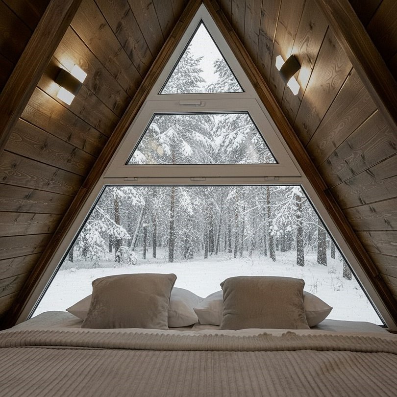 Треугольный двухуровневый коттедж На 1 уровне - уютная просторная гостиная с раскладным диваном - обеденная зона с сервировкой, - кухонная техника для комфортной готовки - ванная комната с душевой кабиной, средства личной гигиены На 2 уровне - спальная зона с панорамным окном с видом на лес в Вашем распоряжении индивидуальная мангальная зона. Для большой компании можем предложить 3 рядом стоящих домаБольшое Шале
