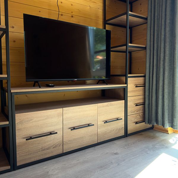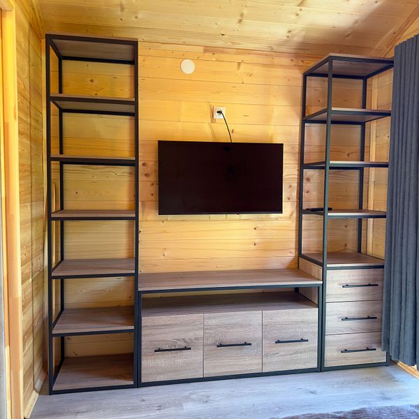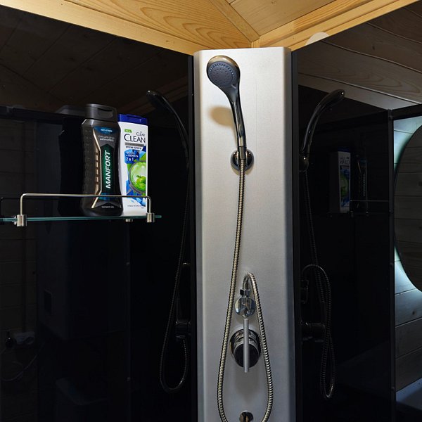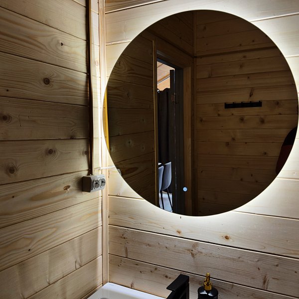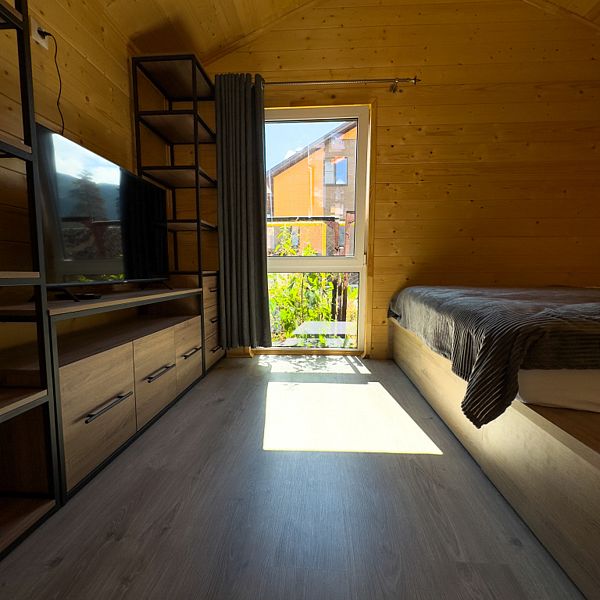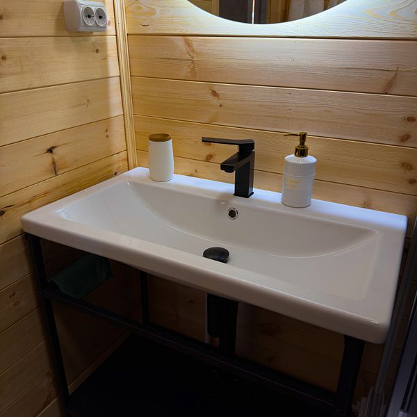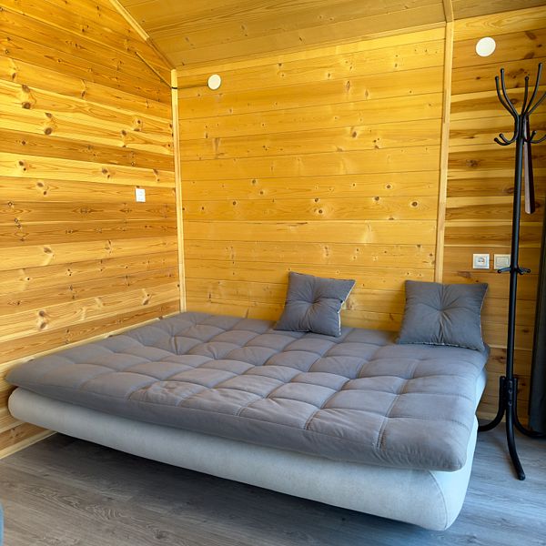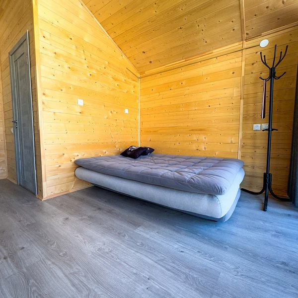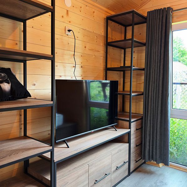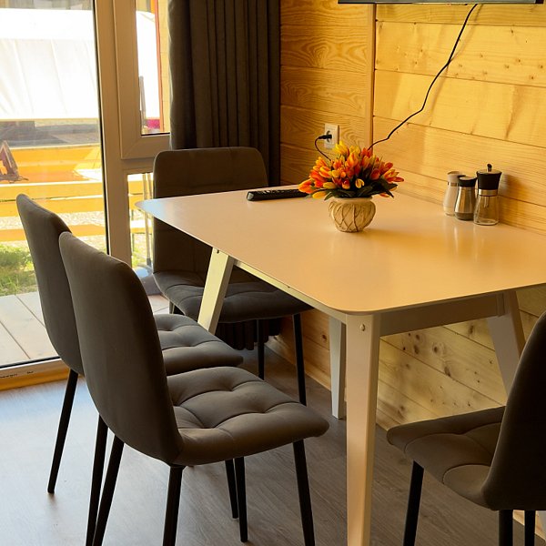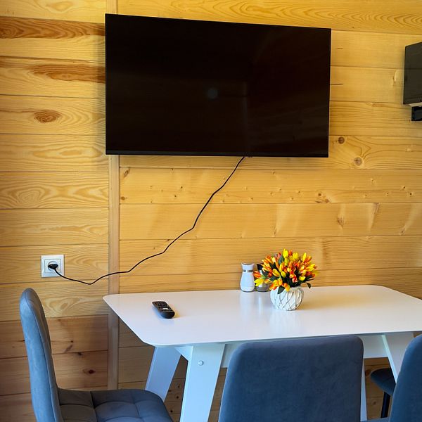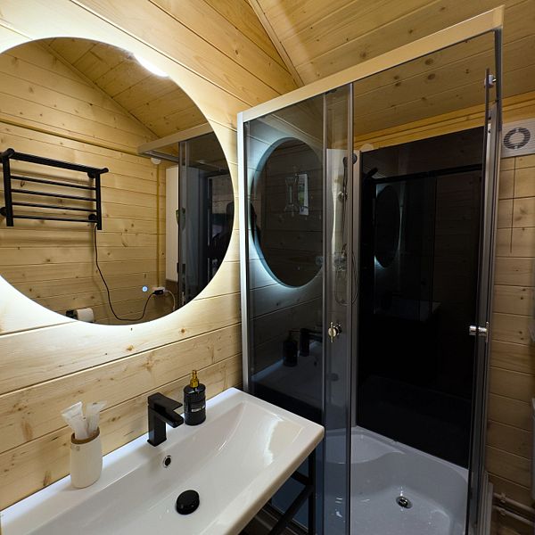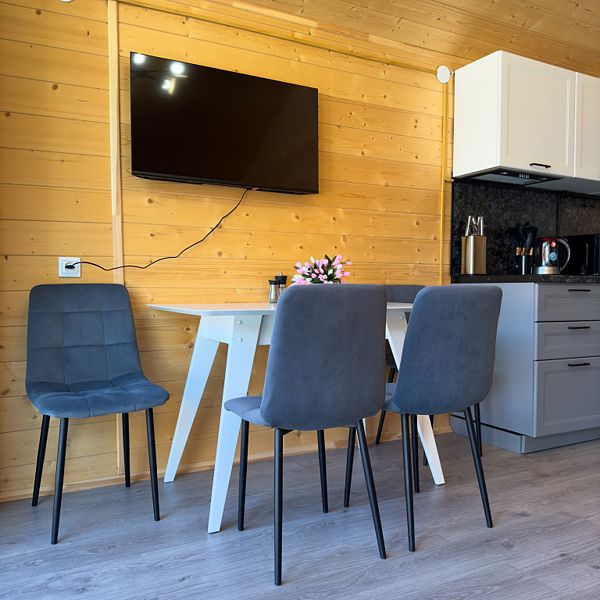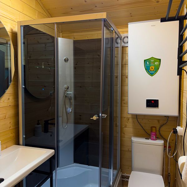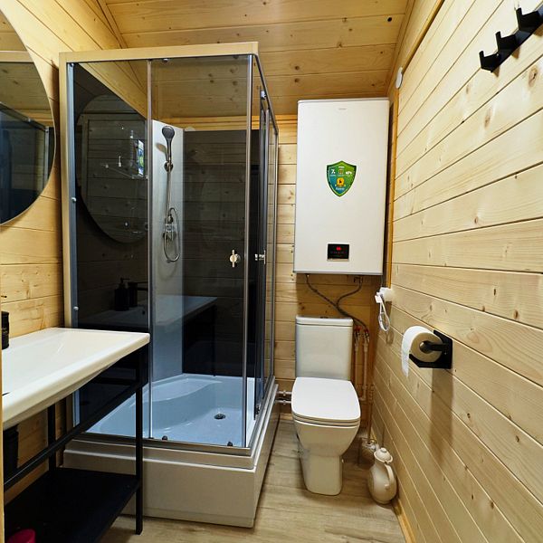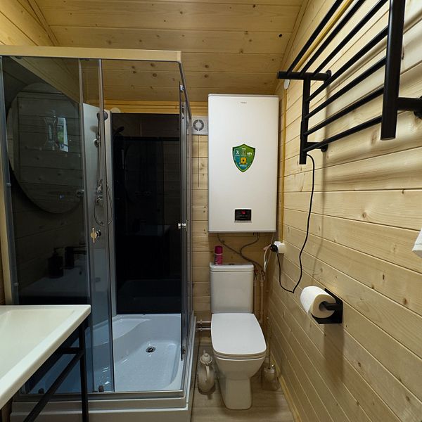 В домике каждый уголок создан для вашего комфорта — в гостиной есть телевизор, где вы сможете расслабиться после активного дня, а для освежения после прогулок предусмотрена современная душевая кабинка с горячей водой и предметами гигиены.