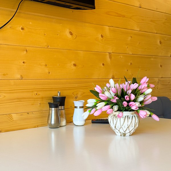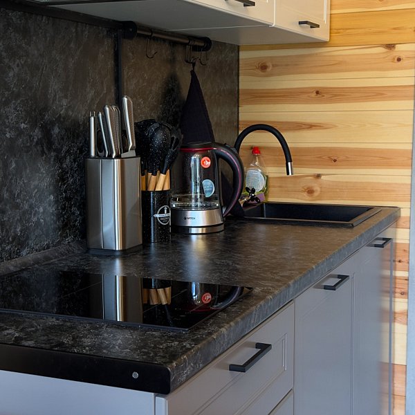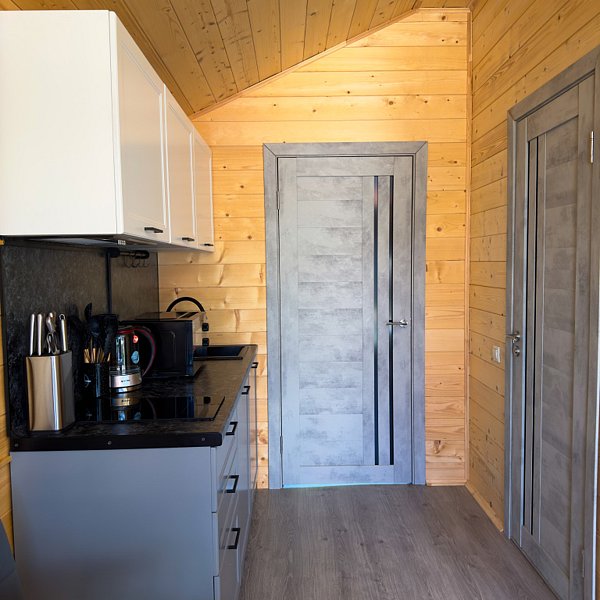 Мини-кухня оснащена всем необходимым для приготовления еды: индукционной плитой, микроволновкой, чайником, посудой, холодильником и прочими удобствами, чтобы вы могли наслаждаться домашними блюдами, даже находясь на отдыхе.