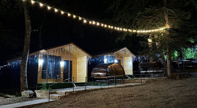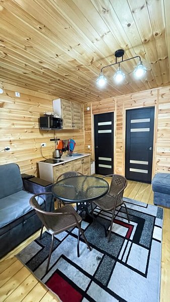 Вашему вниманию будут предложены комфортабельные домики, оснащённые всем необходимым для комфортного отдыха: спальней, гостиной, мини-кухней, техникой и телевизором.