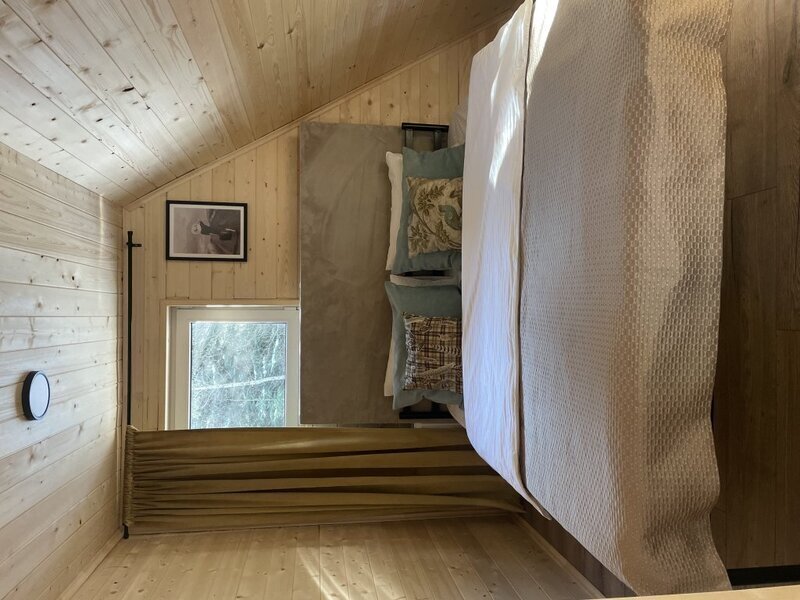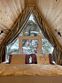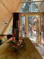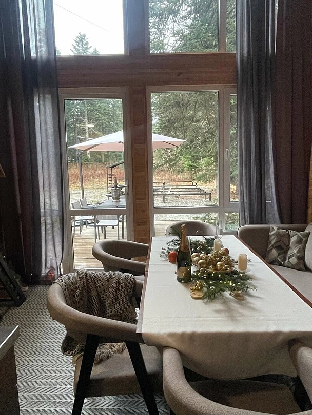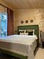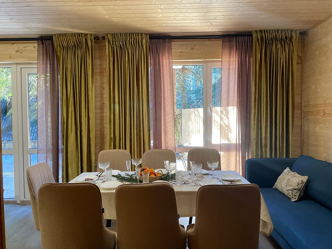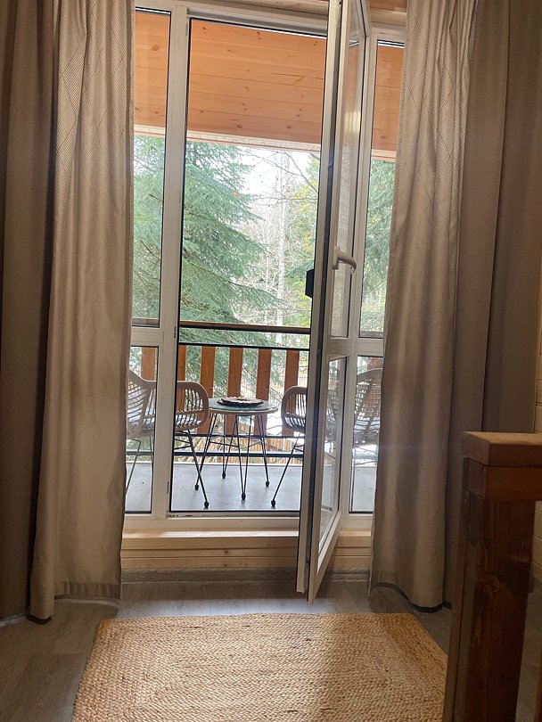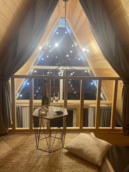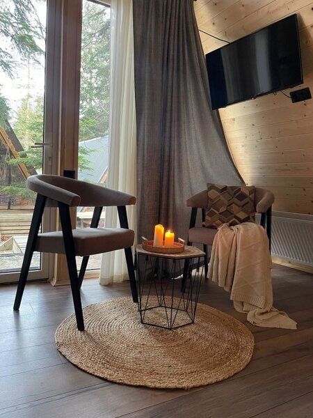 Двухэтажный коттедж с панорамными окнами и большой террасой. Персональная мангальная зона. 3 спальни с двуспальными кроватями. Все комнаты с телевизорами с функцией smart tv. Гостиная совмещена с кухней, есть вся необходимая бытовая техника и посуда (холодильник, микроволновка, электроплита, чайник). В гостиной раскладной двуспальный диван. Два санузла с душевыми кабинами. На втором этаже французский балкончик для романтического отдыха.